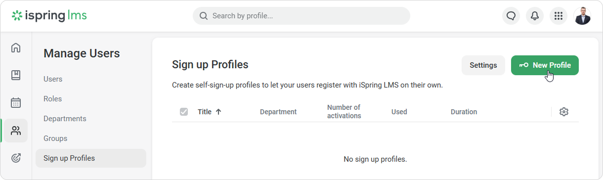 Profile Name The title of a profile you are going to create. Department Users, who will get registered with a user sign up link from this profile, end up in this department. Duration The link will be active within this time range: learners will be able to follow it and sign up for the account. Number of activations This number of times users can use this link to get registered in your account.