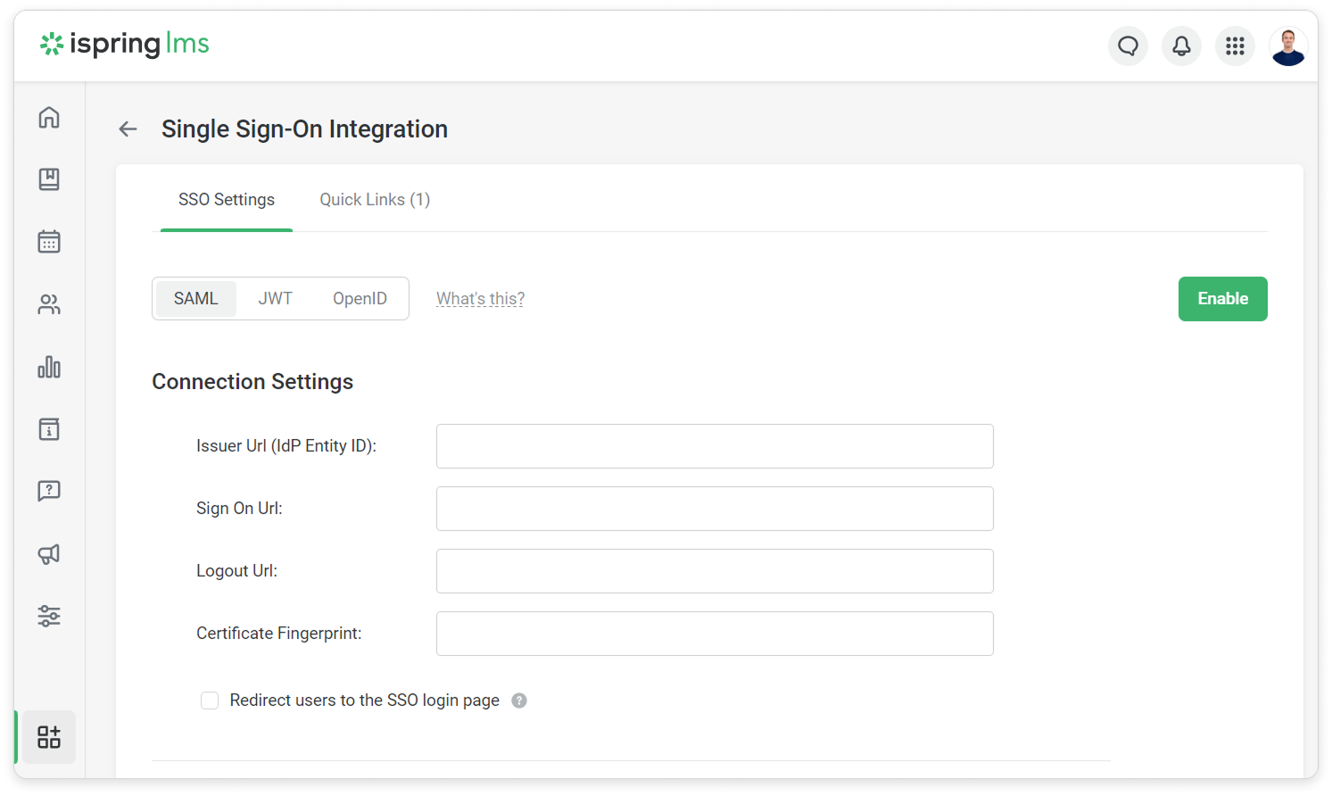 For seamless access to work in iSpring LMS, the administrator needs to configure SSO integration on their side. Integration should be configured within one standard in a specific IdP provider. Multiple standards do not work at the same time in iSpring LMS.