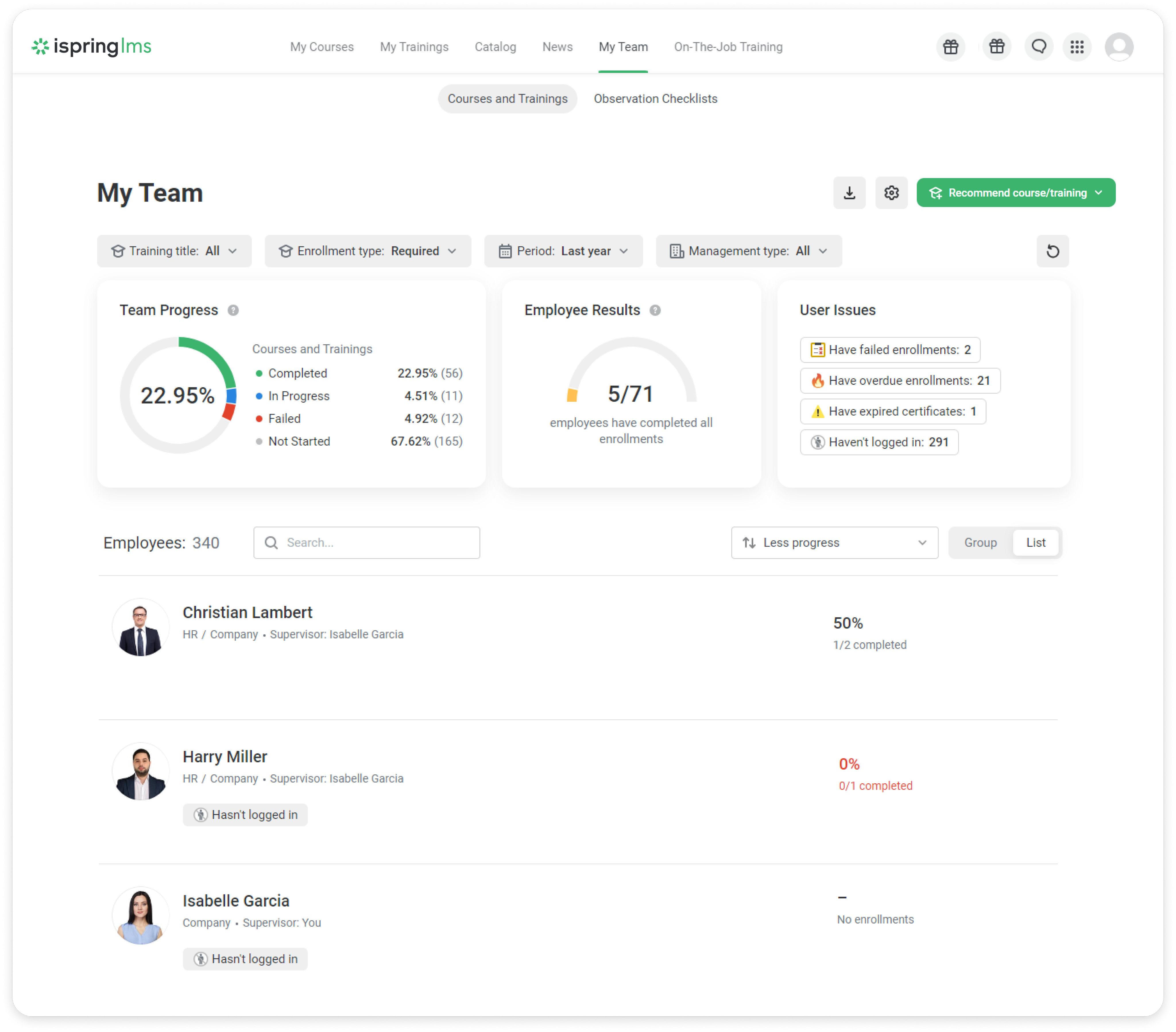 This section shows the total number of employees of your team. The section will help you find out when employees last logged into the system, and how many courses are completed, overdue or failed.