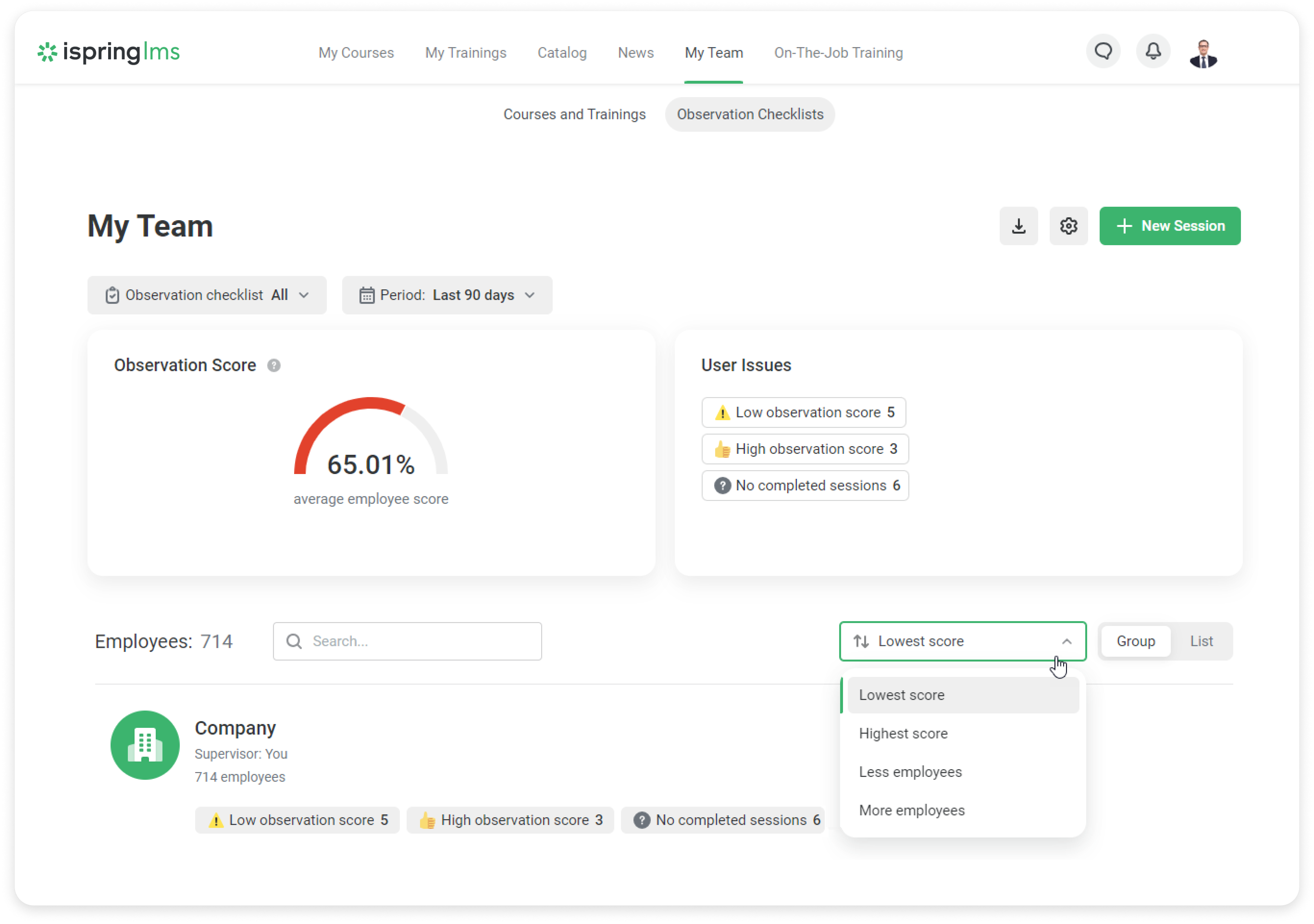 In the section My Team > Observation checklist, you can track the scores of OJT sessions and control how employees meet the standards.