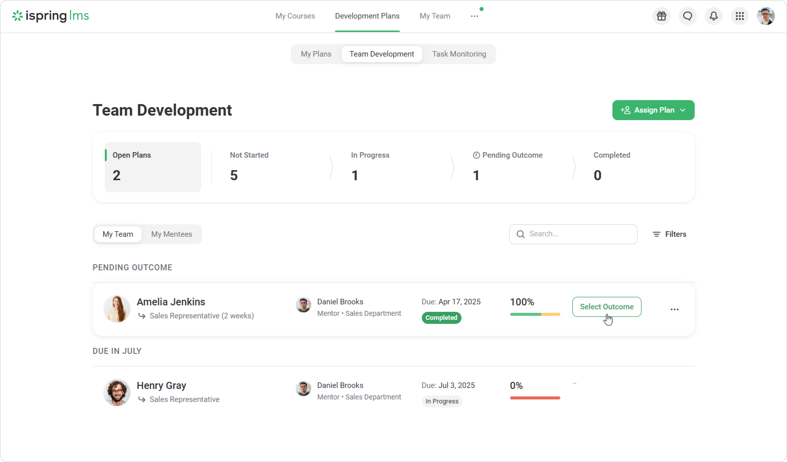 Completed plans will have the Pending Outcome status. If you have access, you'll see the Select Outcome button next to the plan. Otherwise, you can comment on the plan’s outcome.