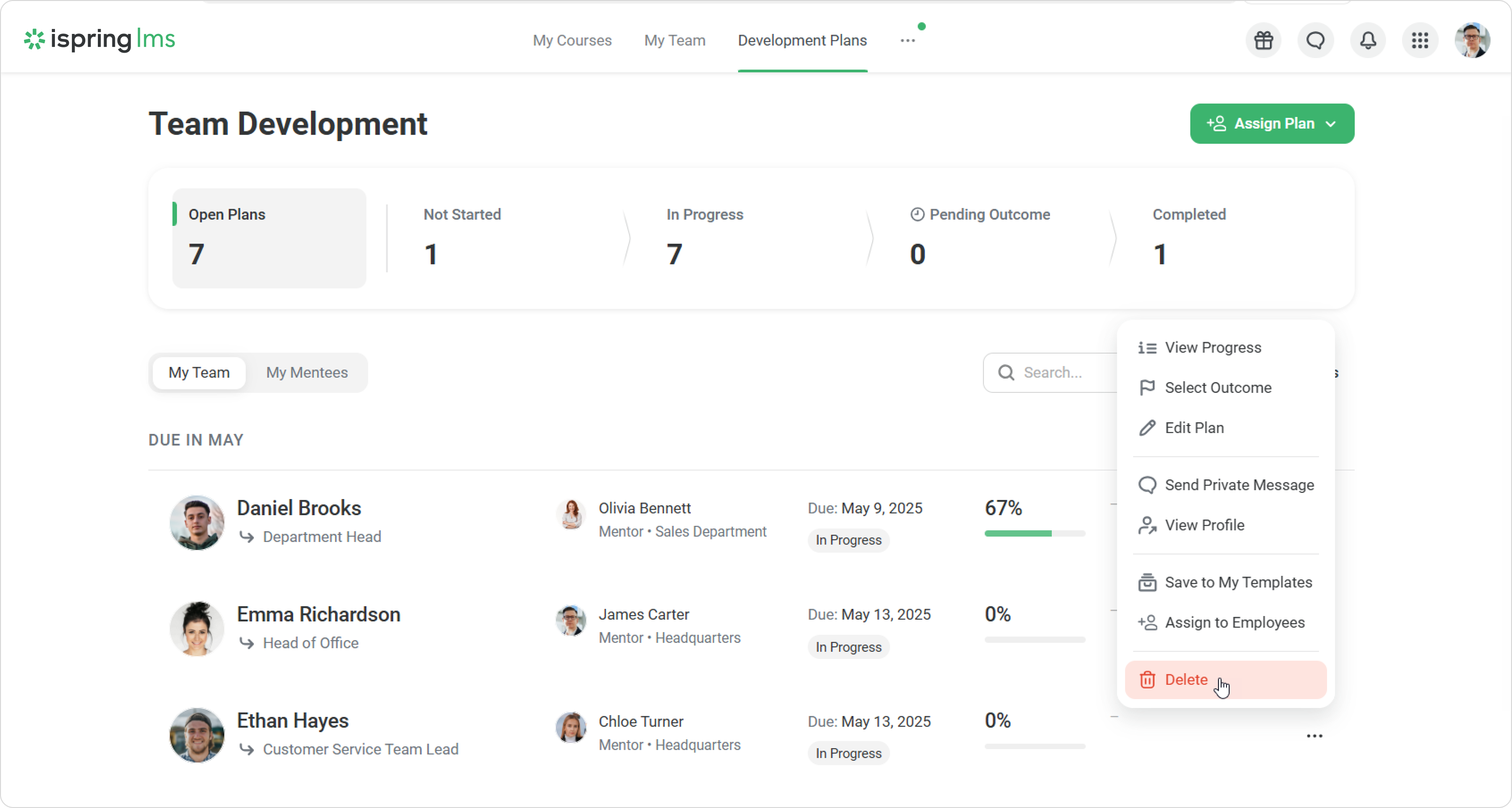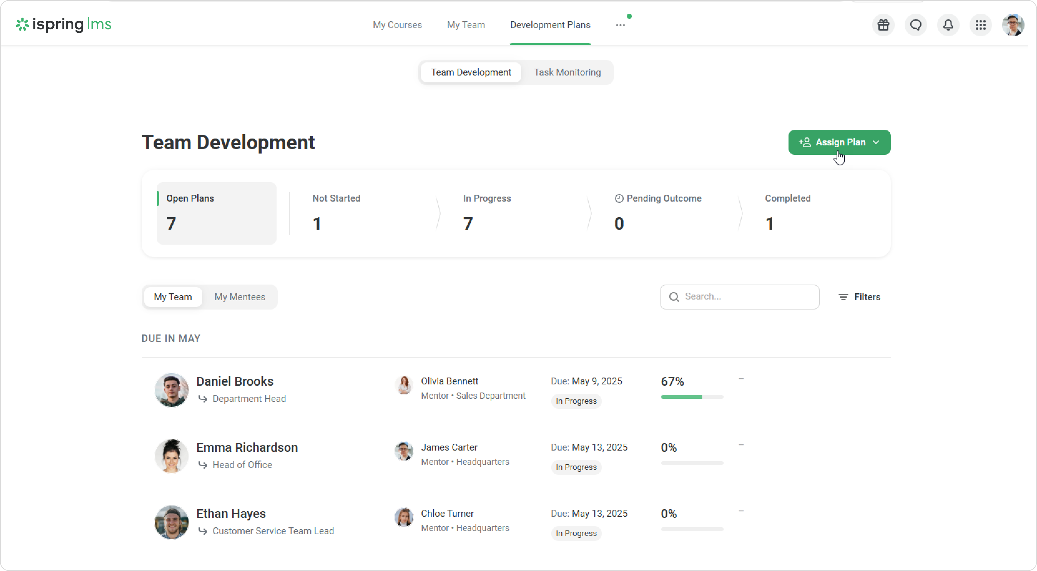 - Review the employee’s job title and the plan’s percentage of completion. The progress bar will show how many tasks were finished on time and how many are overdue. Below that, you’ll find the mentor's comments.