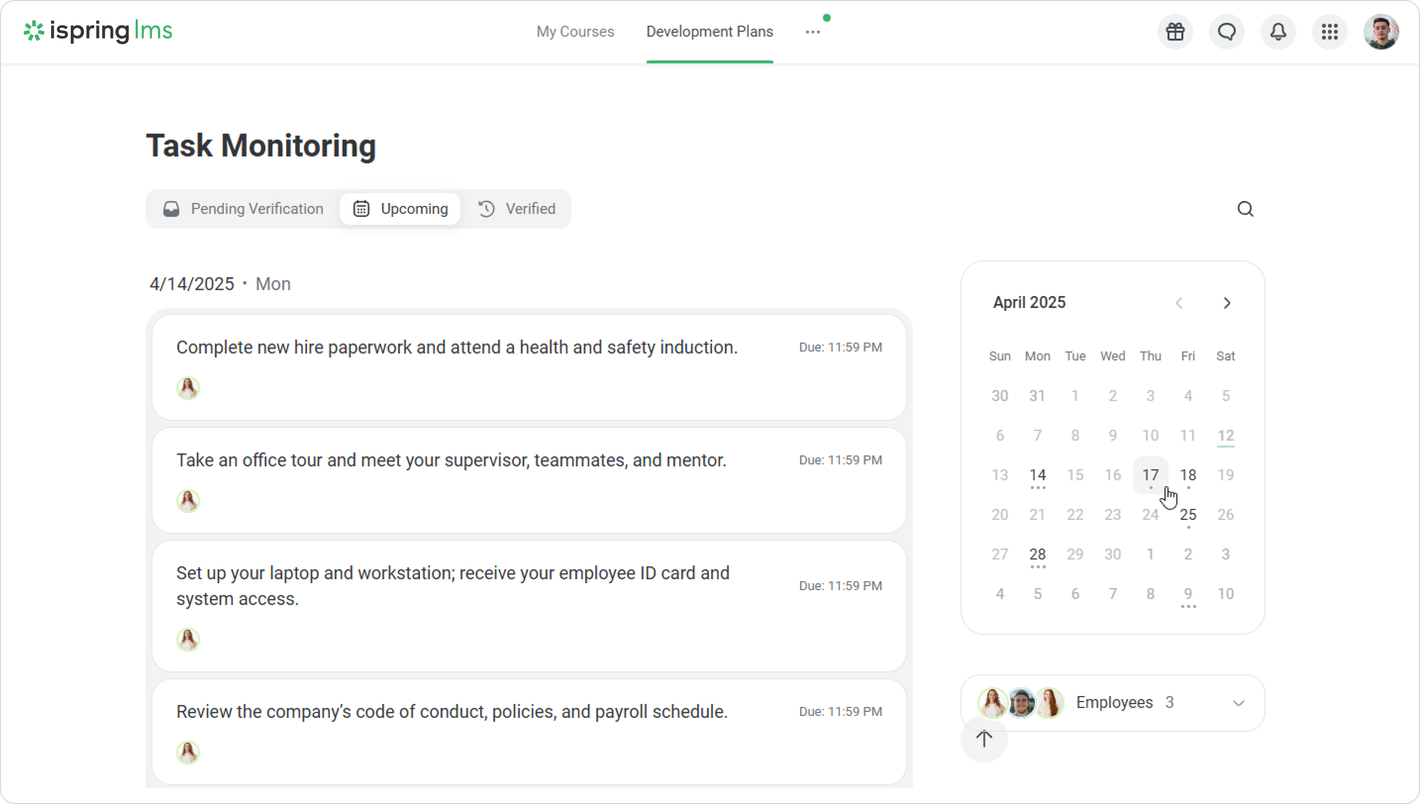 If you're assigned as a task monitor, the Task Monitoring dashboard will appear in the Development Plans section. This dashboard includes tasks that you help your fellow employees with: