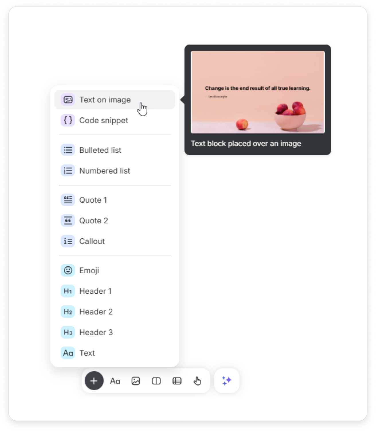 The 'Text on image' block enables you to format a quote, highlight key facts, and emphasize an important rule in a breeze. Plus, you can not only put text on the picture but also add emojis, lists, notes, dividers, links, and code.