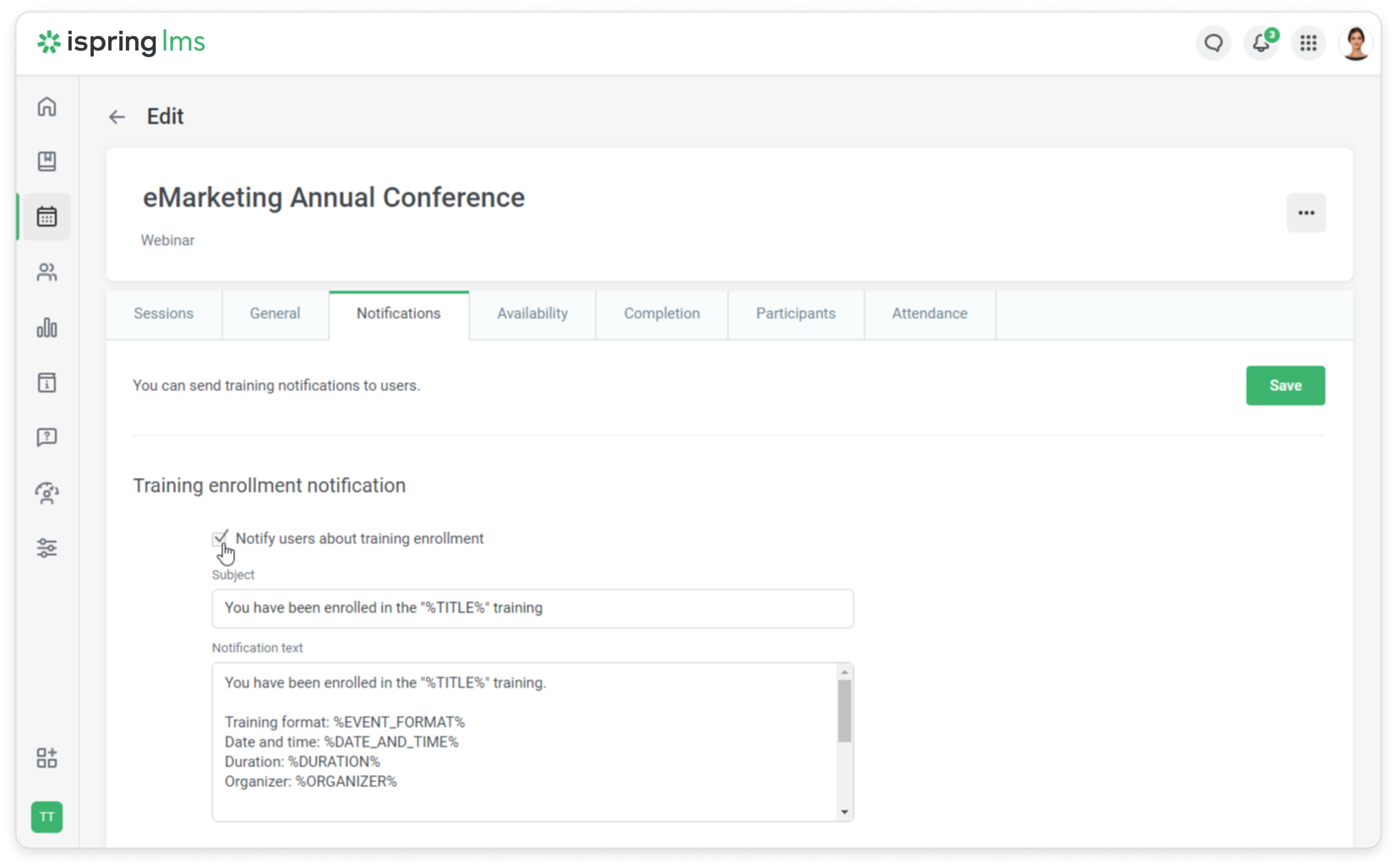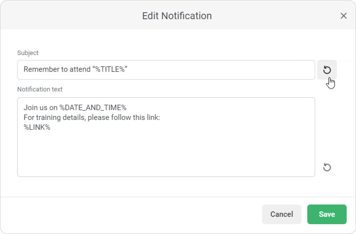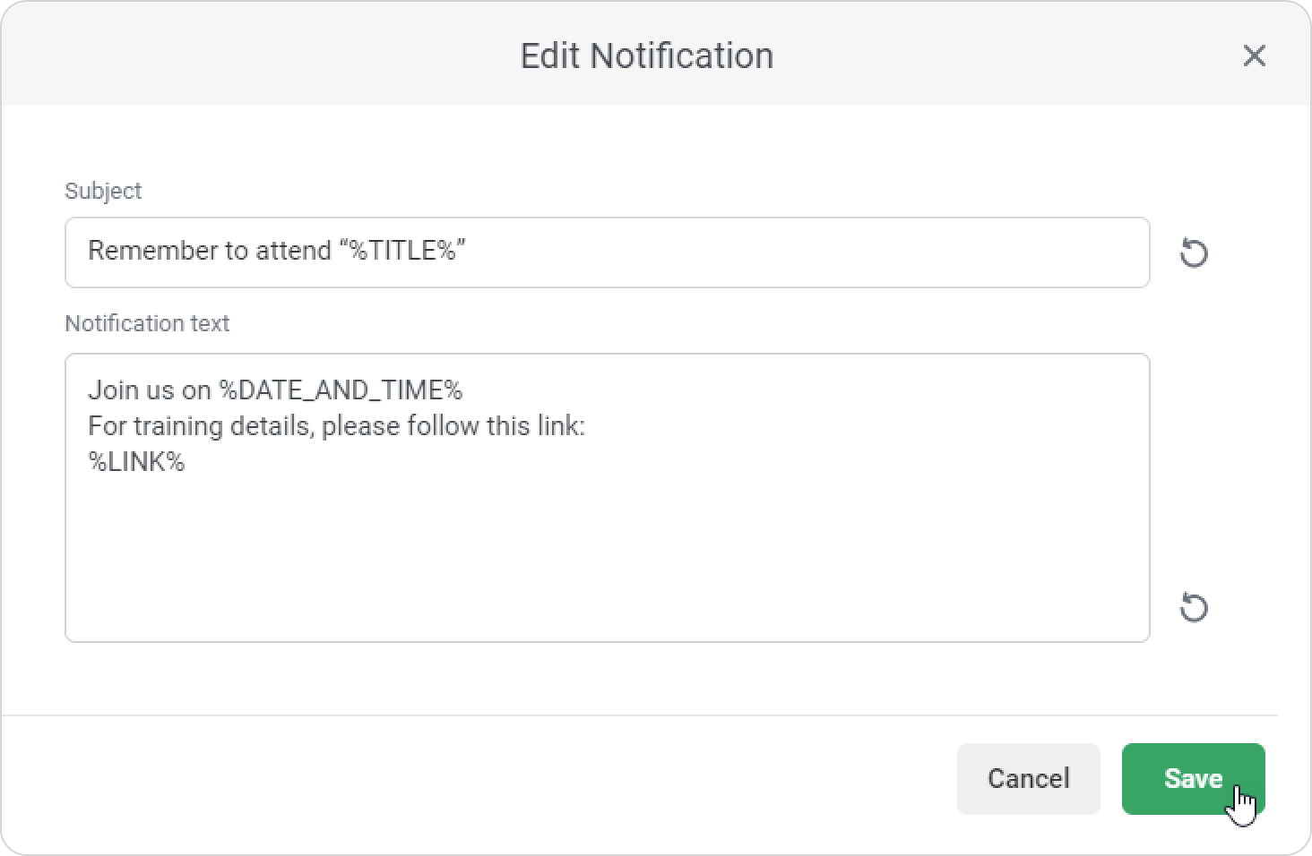 In a multi-day training, you can change the notifications for each day of the training. Users receive custom notifications if the session is specified by an administrator. If the user has chosen a session themselves, they will receive a standard notification with a link to the session.