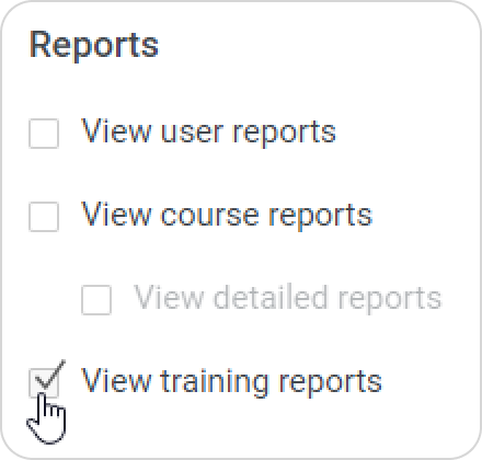 Users with a custom role should have access to the training reports. To give them access, on the Access Permissions page, select the View training reports option.