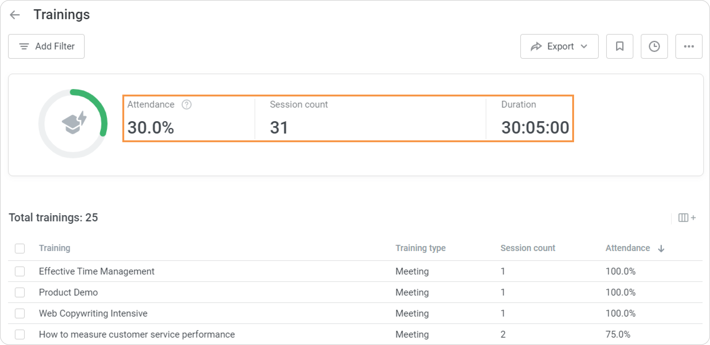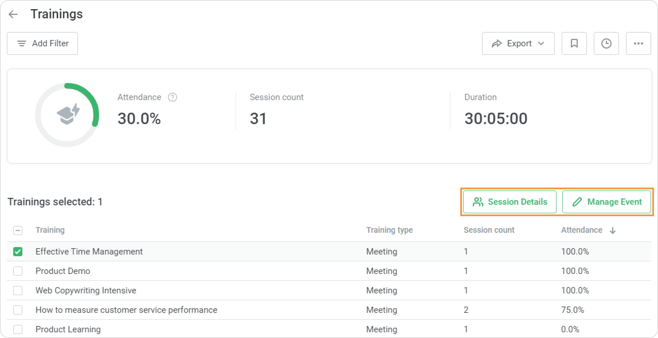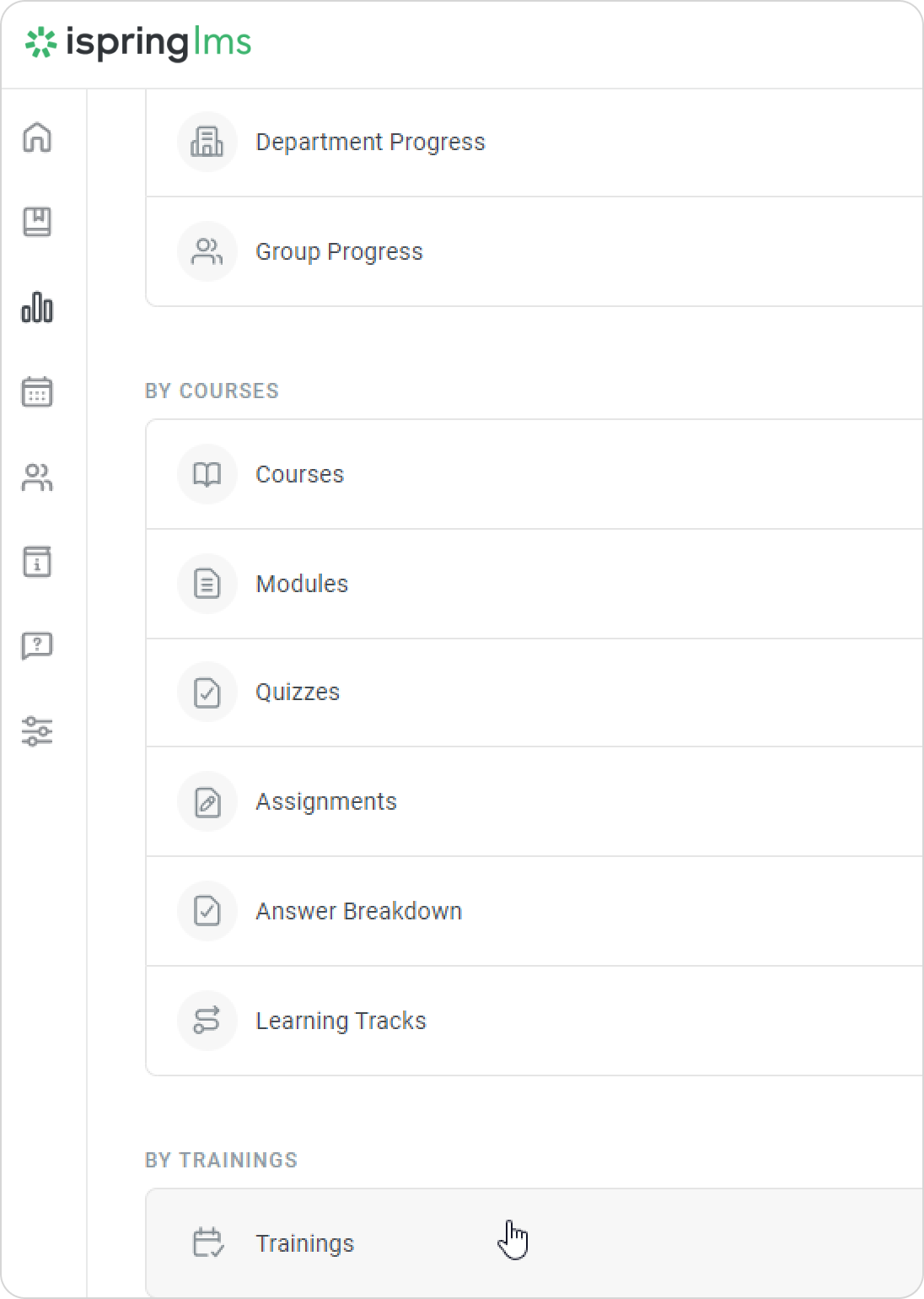 Trainings that were created by the user with a custom role and trainings that were added by the users from the departments they manage and their sub-departments