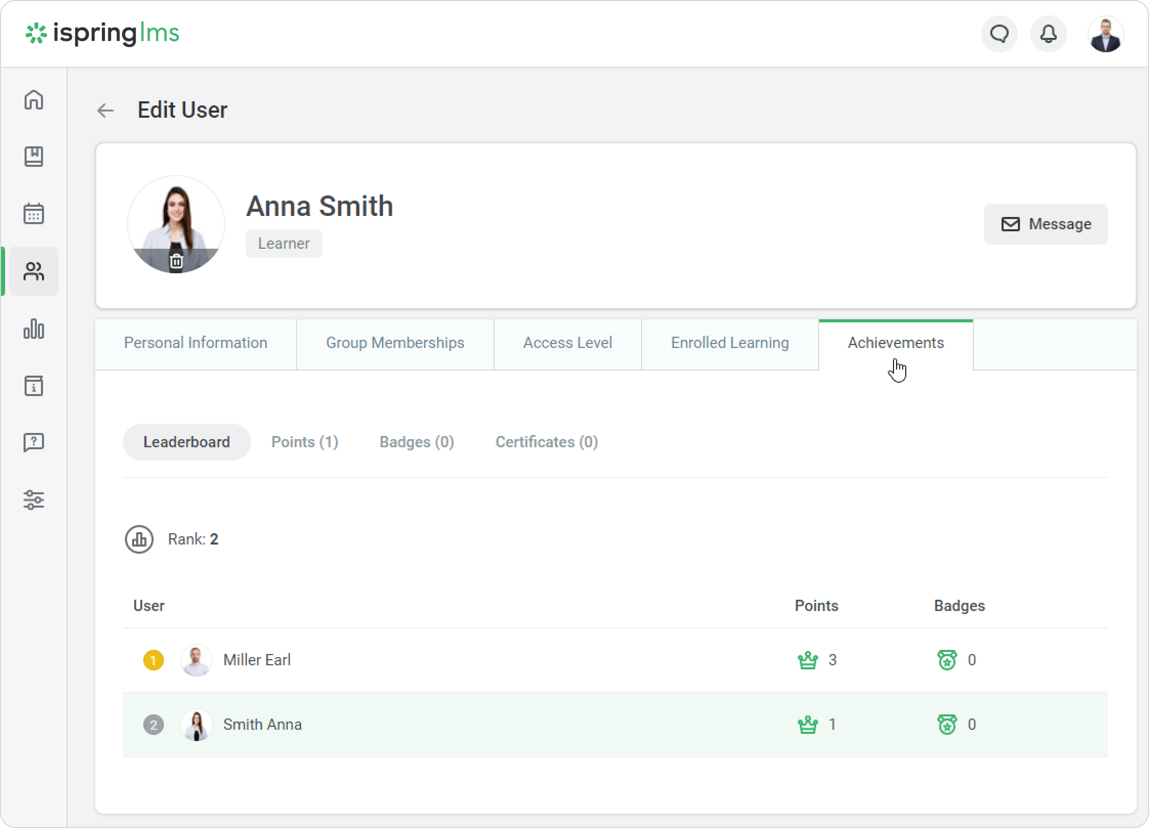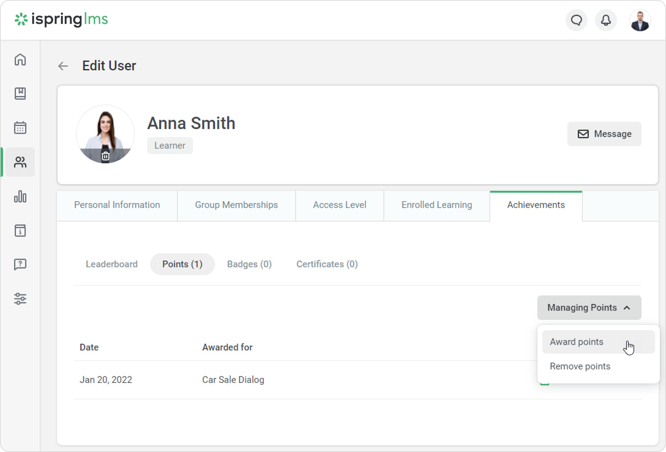 Sometimes, the administrator needs to encourage a user who has passed a course or, contrarily, penalize students for skipping a webinar or not doing their homework assignments. In this case, the option to manually award users with points and deduct them comes in handy.