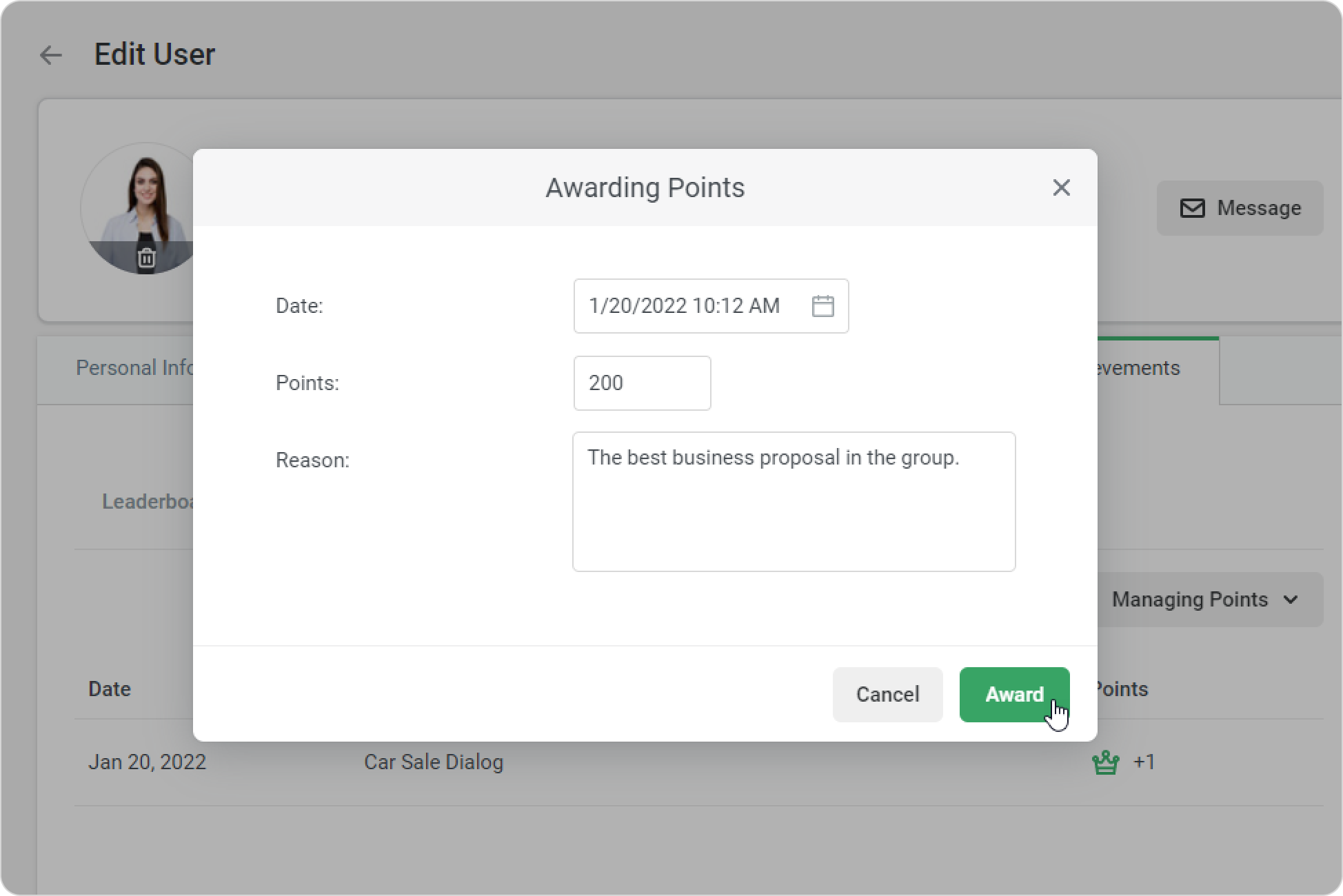 - Then, specify the data and the reason for the action, and the number of points awarded or deducted. Finally, click Award or Remove depending on the operation performed.