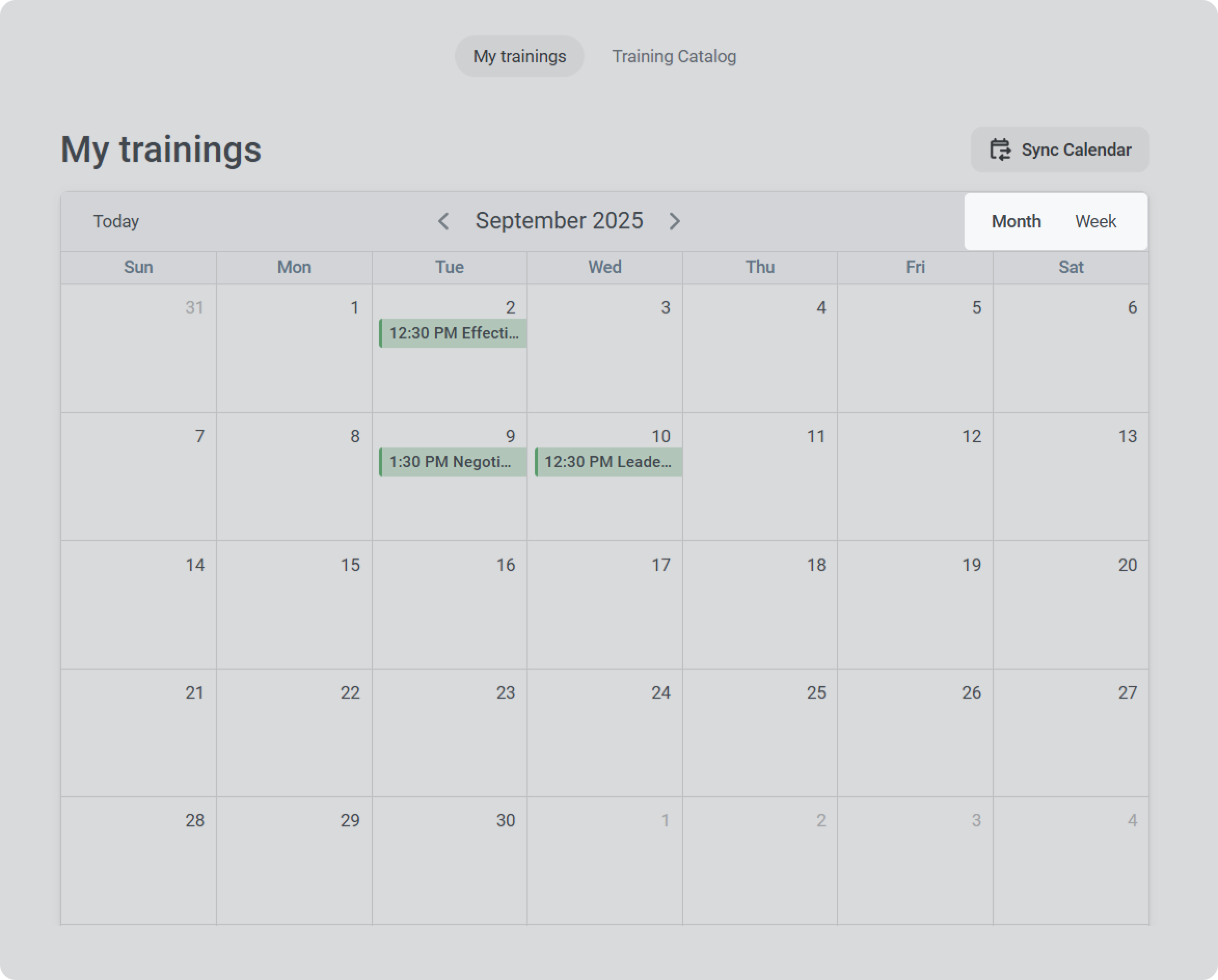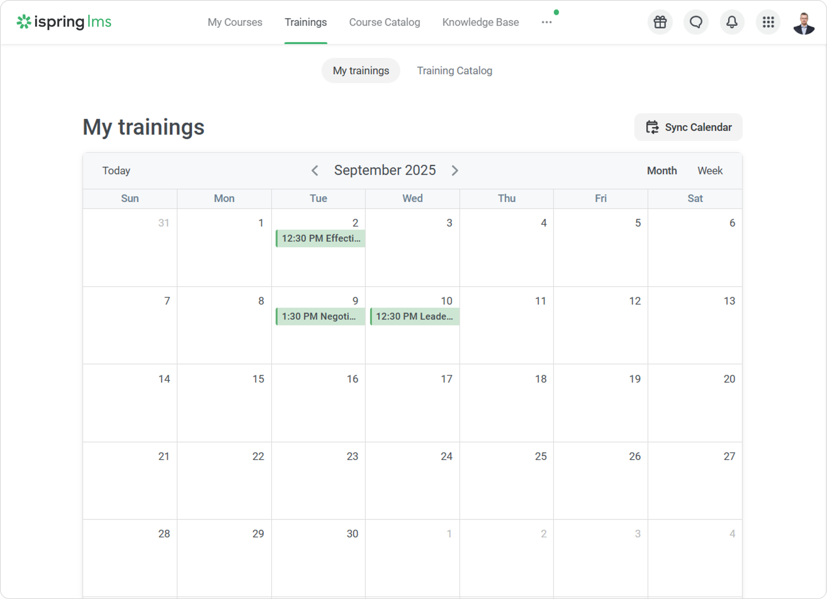 iSpring LMS User Portal Current: User Trainings User Trainings In the My Trainings section, users can view the trainings or webinars they are invited to. Filtering Trainings by PeriodCheck trainings weekly or monthly to organize your schedule.Viewing Training DetailsTo view detailed info on a training or a web meeting:Click on the training title in the calendar, then select Go to Training.On the training page, you can view all the main information on it. Learn more about the iSpring LMS trainings in the Trainings section. ×