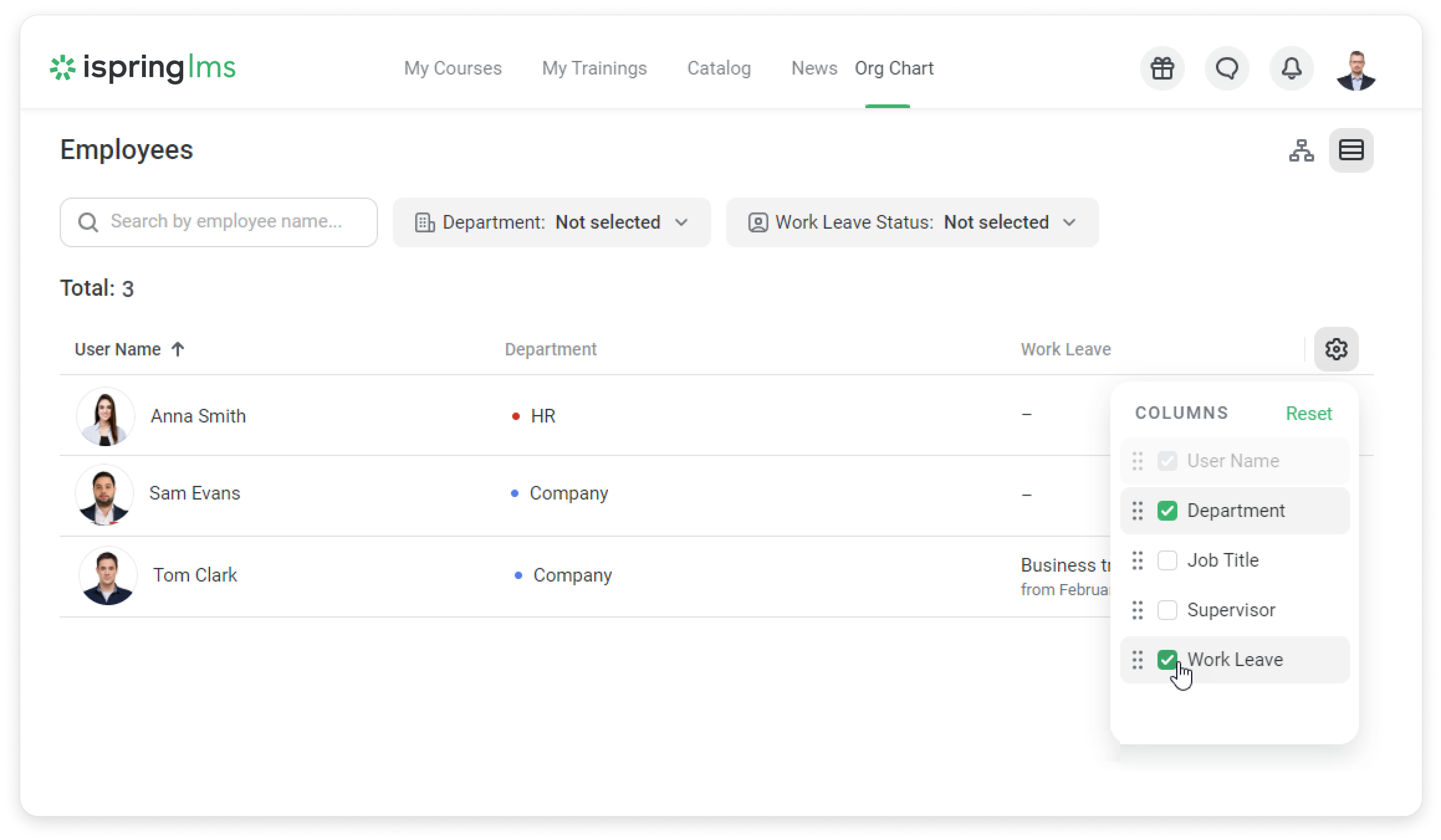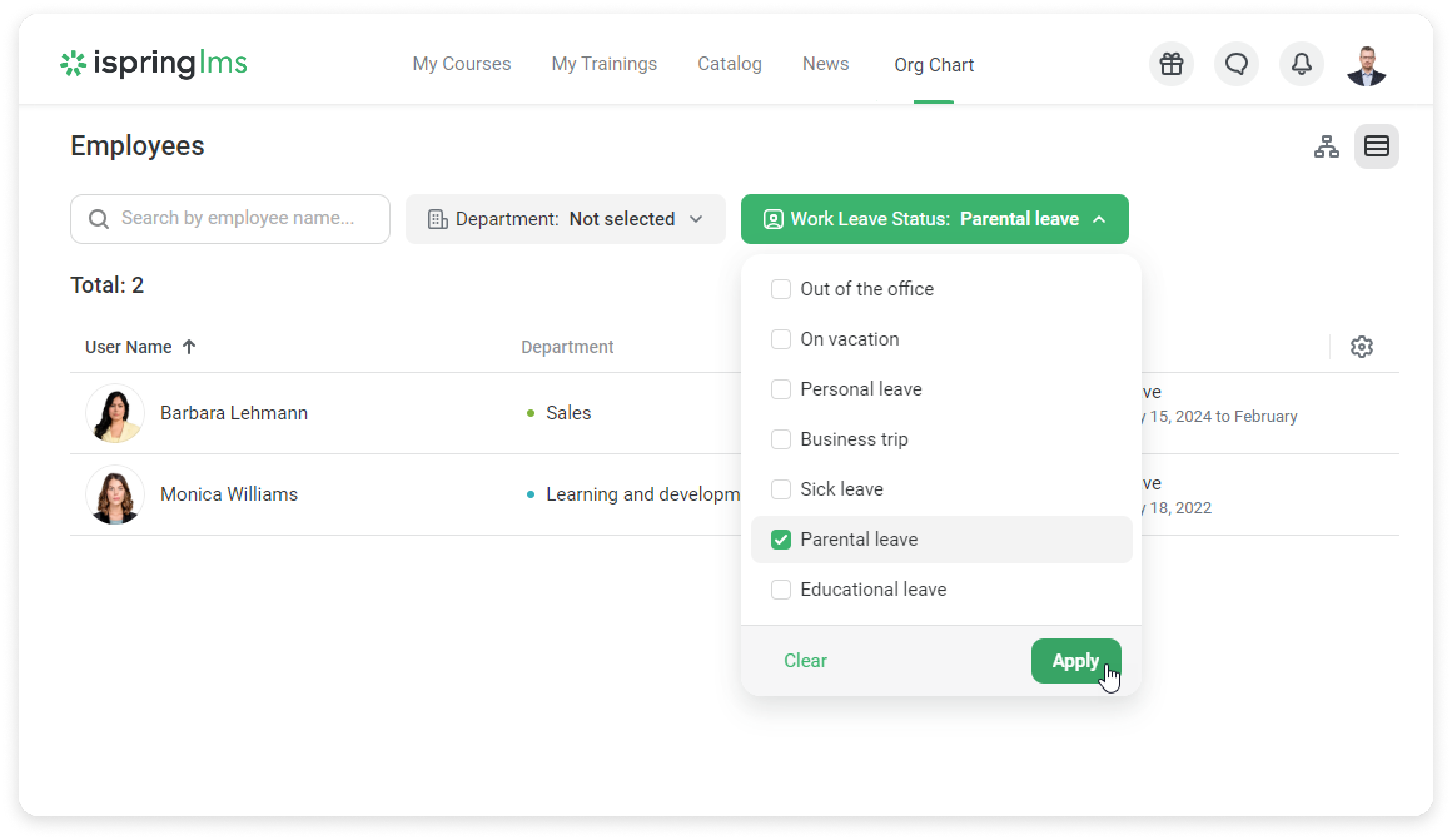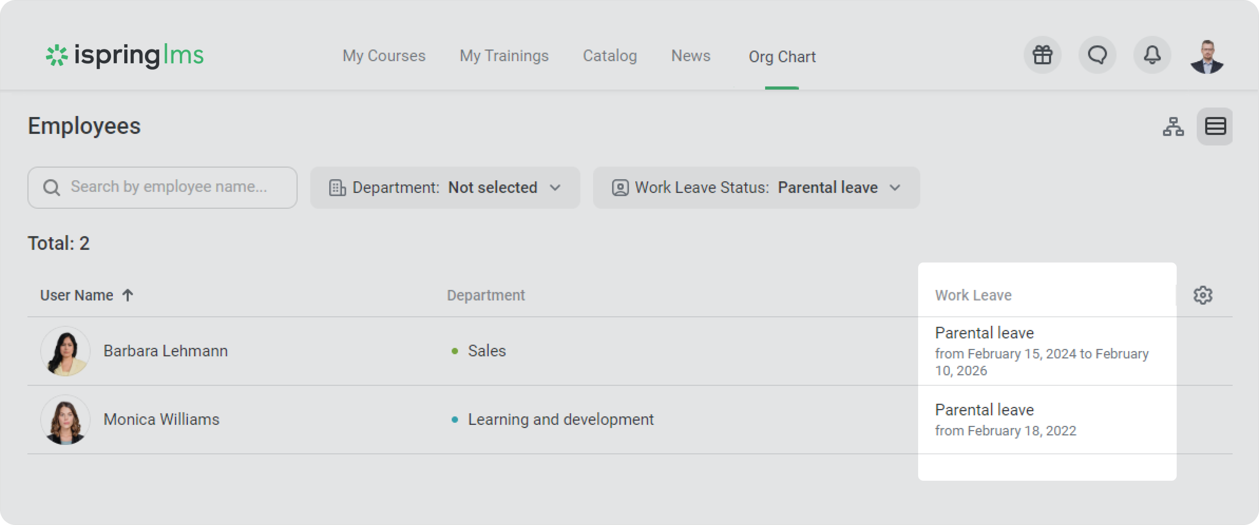 iSpring LMS Users Work Leave Status Current: Work Leave Statuses in the Org Chart Work Leave Statuses in the Org Chart Users can search for colleagues by their work leave statuses in the list of employees in the org chart.Go to the org chart and open the list of employees. In the settings, select Work Leave.You will see the Work Leave filter. Select the status. For example, you can find which employees are on parental leave.Done! You’ve found those who are currently on parental leave.Users will also see the work leave status of their colleagues in the org chart in the public profile. ×