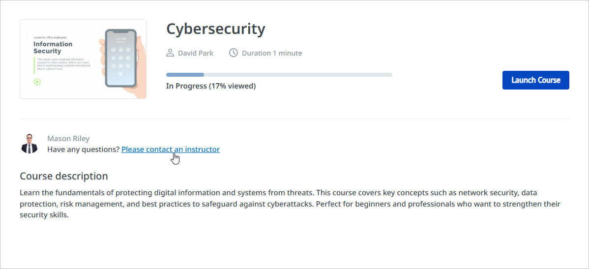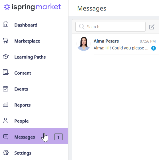 iSpring Market Users Instructors Current: Exchanging Messages with Instructors Exchanging Messages with Instructors You can message your instructor directly from the platform and get feedback on your course progress.Open the course and click the Please contact an instructor. Make sure that private messaging is enabled in the Main settings. Otherwise, the instructor won't be displayed on the course page. On the Messages page, type your text and send it.The instructor will see a notification about a new message in the Messages section of their account.Now the instructor can reply to the inquiry and/or delete the chat. Learn more about messaging in iSpring Market in the Messages article series. ×