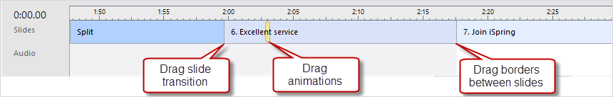 To change the length of the slides and transition effects, move the borders between them. To display transitions and animations on the timeline, changing slides and starting animations should be configured to be triggered on click.