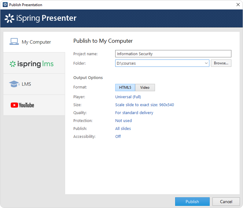 In the opened window, select a publishing destination. •My Computer - Publish a course on your computer. • iSpring LMS - Publish a course to your iSpring LMS account. • LMS - Publish a course to SCORM, AICC, Tin Can, or cmi5 format for subsequent upload to any LMS. • YouTube - Publish a course in video format and upload it to your YouTube channel.