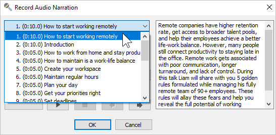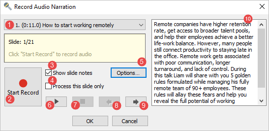 1. Slide list | Choose the slide from which you will start recording audio narration. |