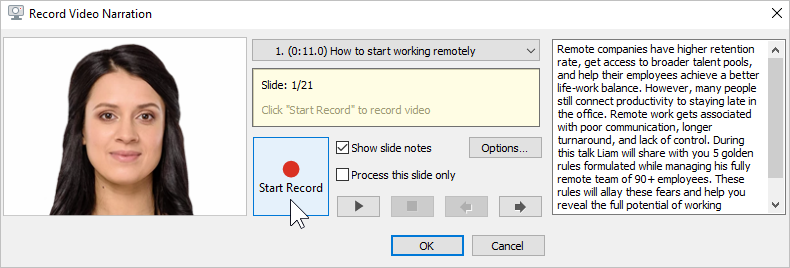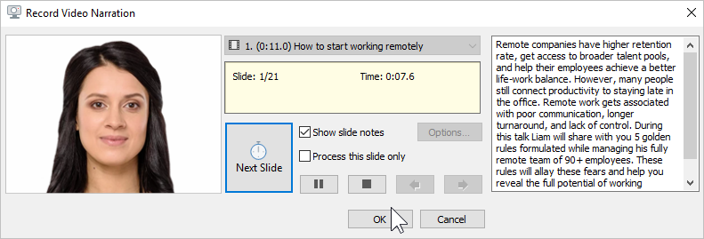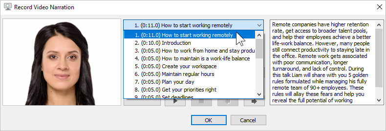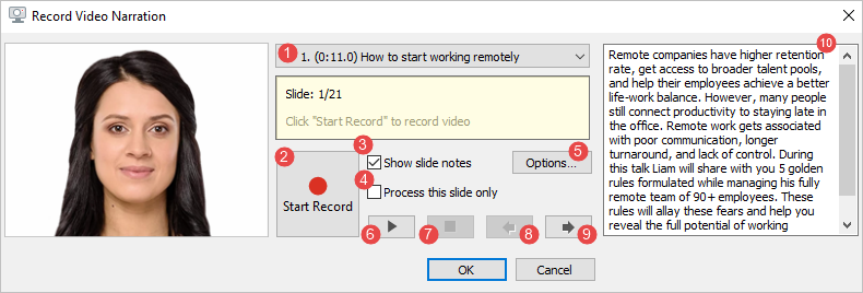 1. Slide list | Choose the slide from which you will start recording video narration. |