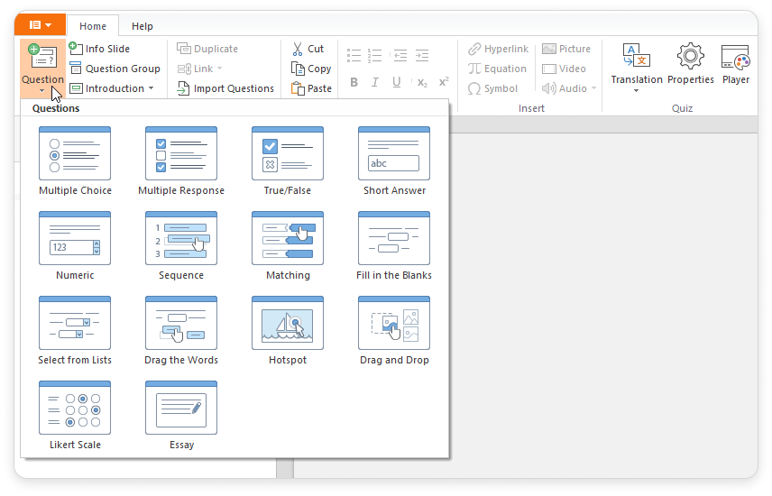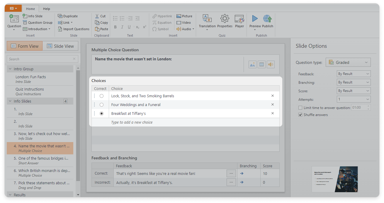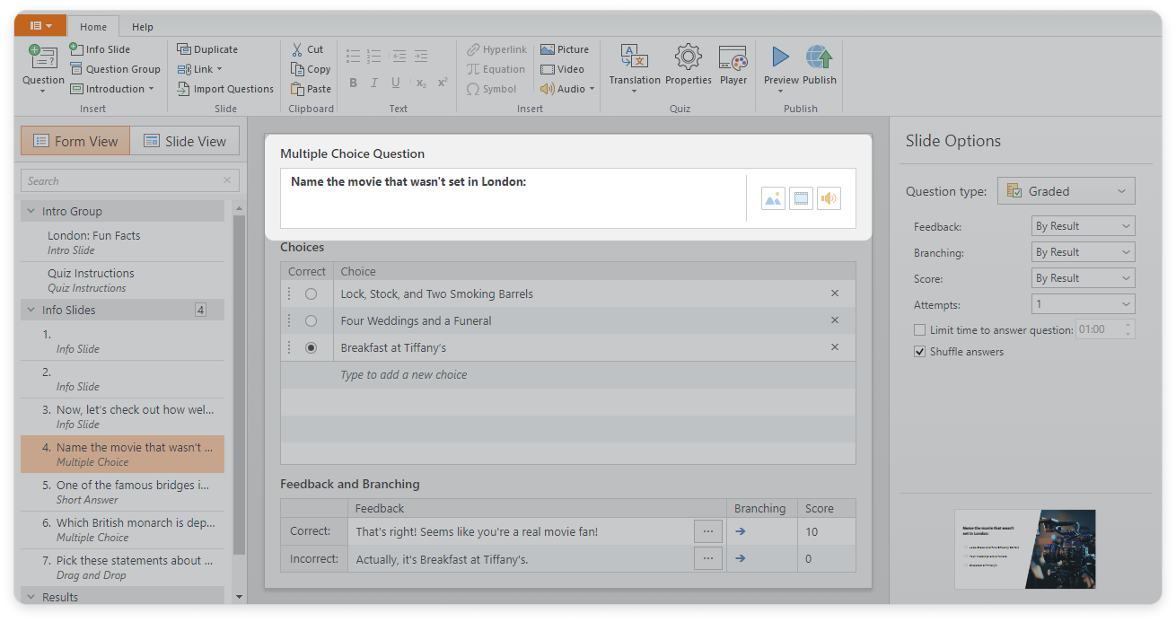 - Newly added questions have the default parameters which are set in the Question Properties section of the Quiz Properties. If necessary, specify specific parameters for the current question in the Slide Options section on the right side of the editor.