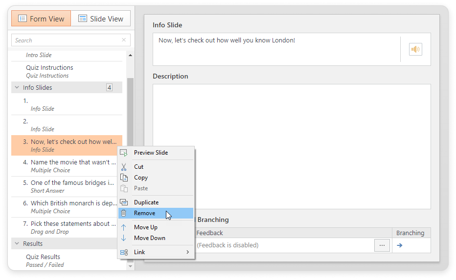 - Enable branching if you want to control the order of questions in quizzes depending on the students' answers.
