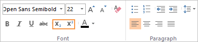 The superscript and subscript are symbols that are displayed above or below the standard text line. To switch the text to the superscript or subscript, click the corresponding buttons on the toolbar.