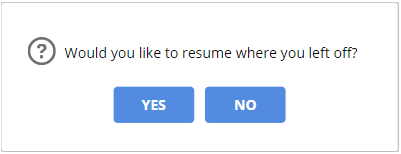 Prompt to resume Users can choose from which point they want to continue the quiz: from the question at which they stopped, or from the beginning.