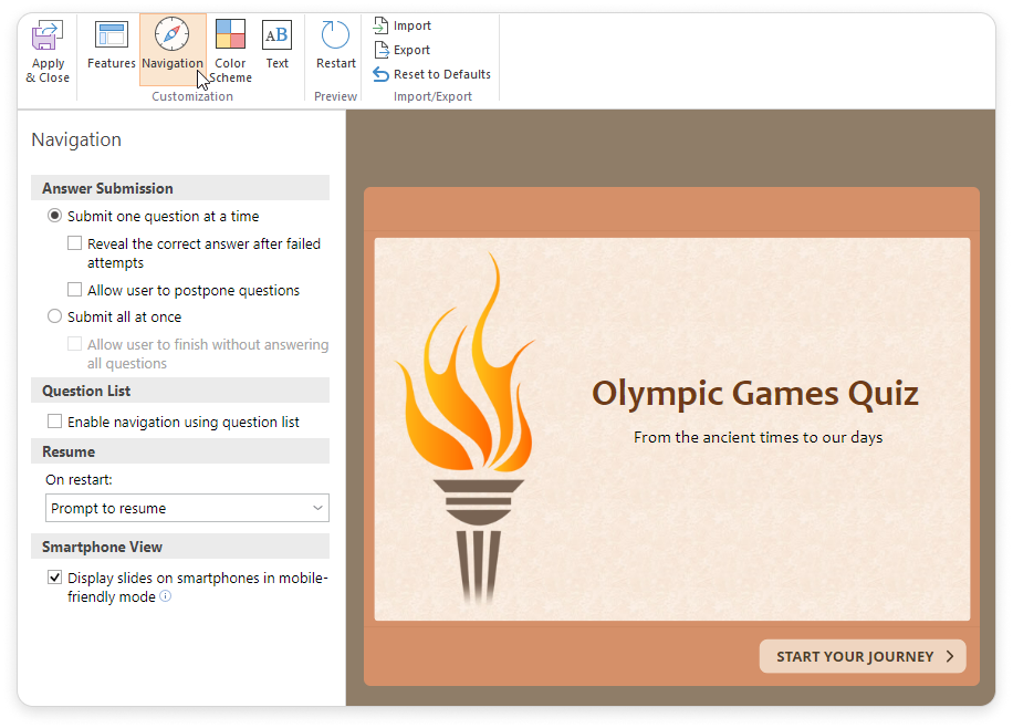 To configure navigation settings for the quiz, click theNavigationbutton on the toolbar.