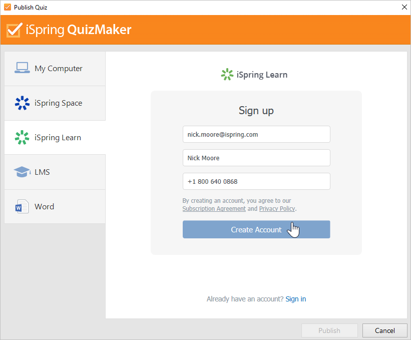 - Create a new free iSpring Learn account right in the publishing window. Enter your email, name, and phone number, and click Create Account. You will receive an email with your login details.