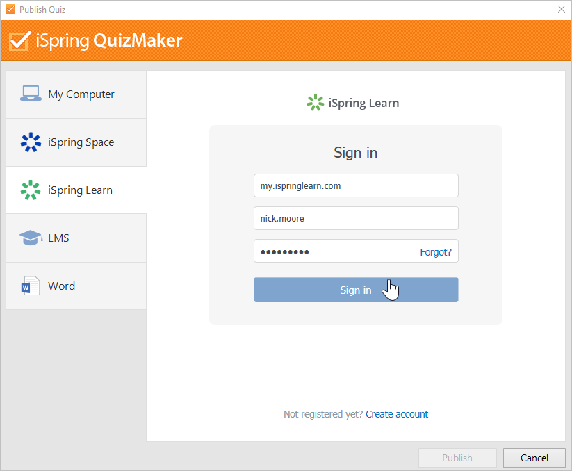 - If you are already registered, click the Sign in link at the bottom of the window and enter your email and password for your iSpring Learn account. Then click Sign In. The specified data will be saved in iSpring QuizMaker, and you do not have to enter it every time.