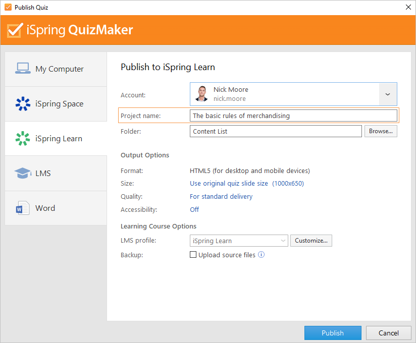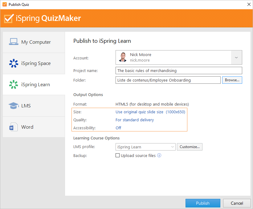 • In the Backup field, select Upload source files so that you and your administrators will be able to download the source files of the quiz in iSpring Learn.