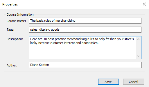 In the opened window, add tags, description, and the quiz author, and set up progress and completion parameters.