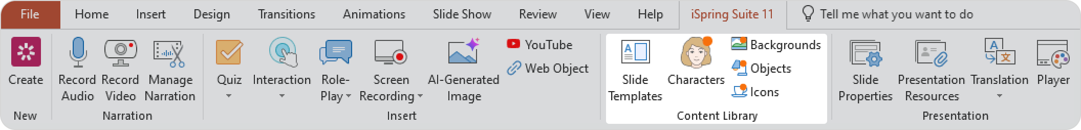 With iSpring Suite and iSpring Suite AI, you get full access to all characters, icons, objects, backgrounds, and slide templates from the Content Library.