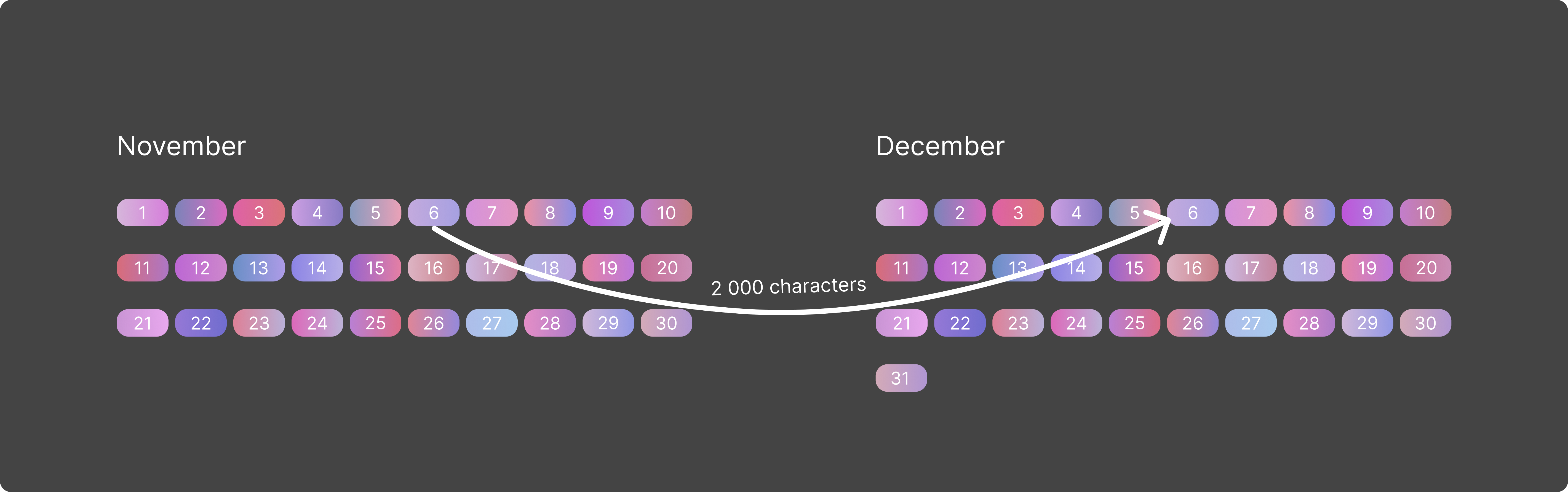 For example, if you used 2,000 characters on November 6, those 2,000 characters will be added back to your balance on December 6. (Dates may vary slightly depending on days per calendar month.)