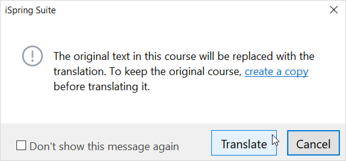 iSpring Suite will notify you that the original text will be replaced with the translation.