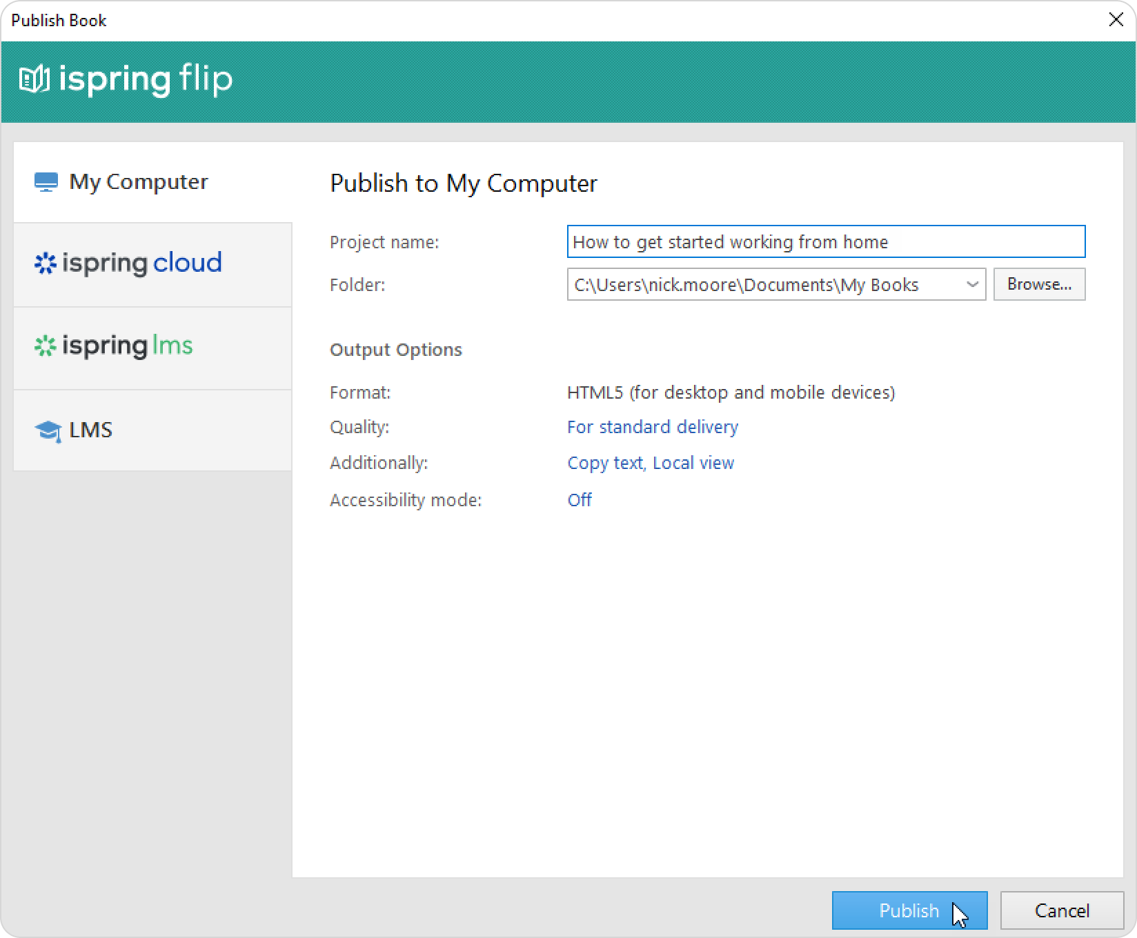 - Then select a publishing option in the Publish Book window and select the output parameters you need. Next, click Publish.
