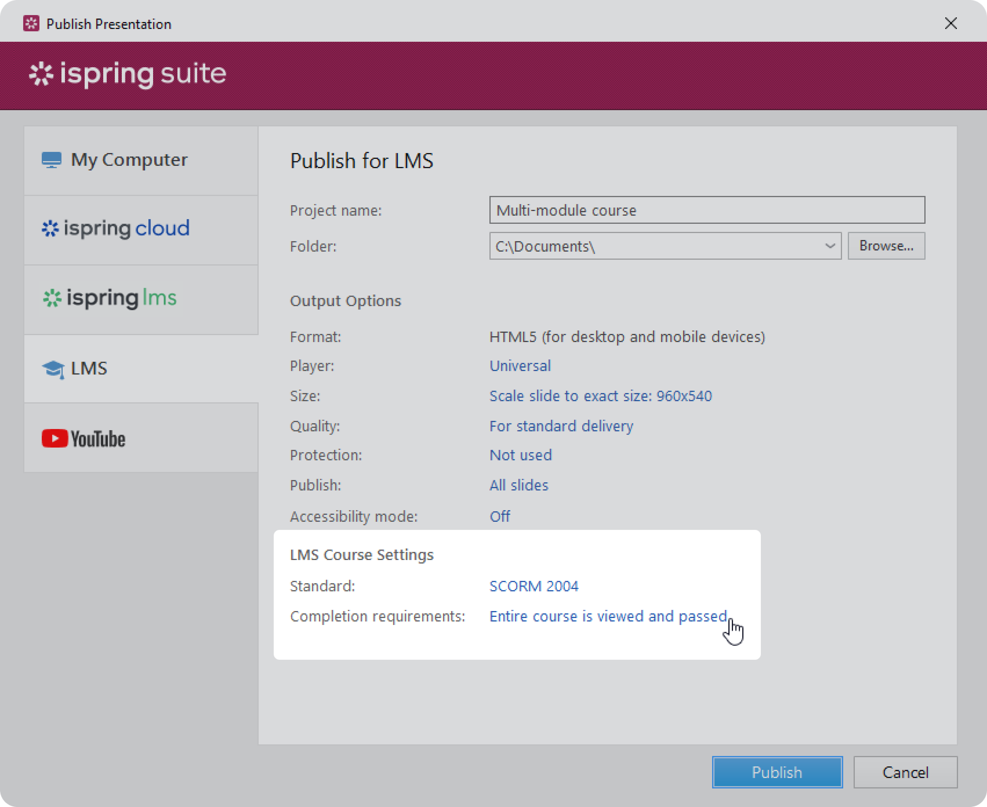 Here we’ll examine eight scenarios and learn how to configure the course completion requirements in iSpring Suite for each situation.