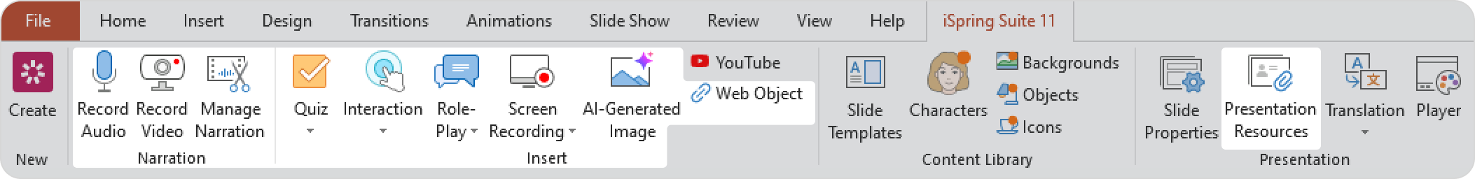 There are some actions with the iSpring Suite toolbar that don’t create a project folder. If you insert a Character, a Slide Template or a YouTube video, they become a part of the PPTX file. Some settings will be saved to the system folder and the PowerPoint file as well.