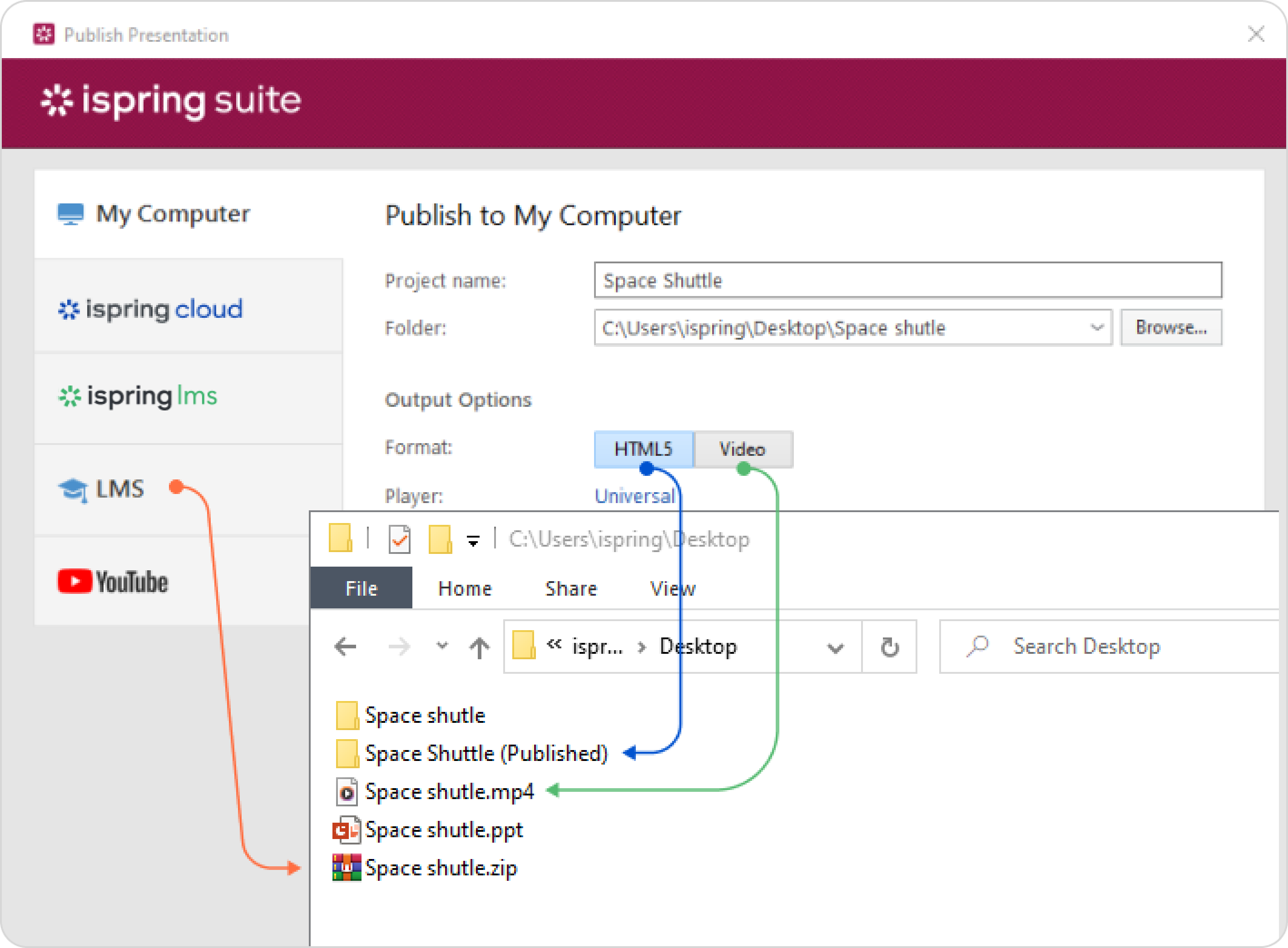 iSpring automatically creates several folders and files with similar names, including the project folder and the output folder. If you store many projects in one common folder, it will soon be flooded with similar folder names. That’s why we recommend having a separate folder for each project.