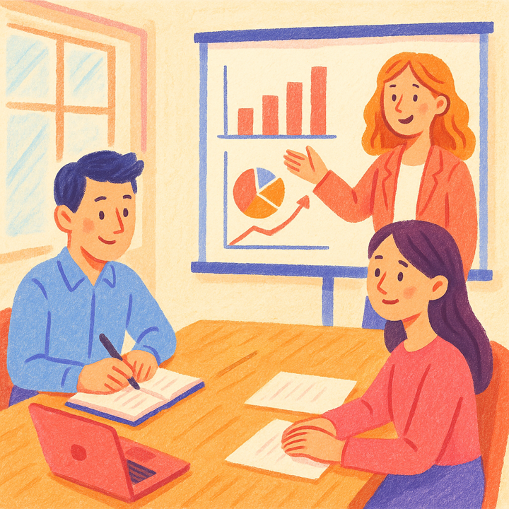 Three office employees are discussing a project at a table in a bright meeting room. A man is sitting and taking notes in a notebook, one woman is sitting and listening attentively, and another woman is standing next to a projector and presenting charts on the screen. The illustration is friendly and vibrant. Faces are slightly cartoonlike with small dot eyes and a soft blush on the cheeks. Front view, light brush texture, lively lines, positive atmosphere. Square format, 1:1.