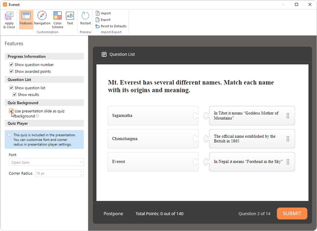 The background of the current slide will be automatically applied and displayed in the quiz.