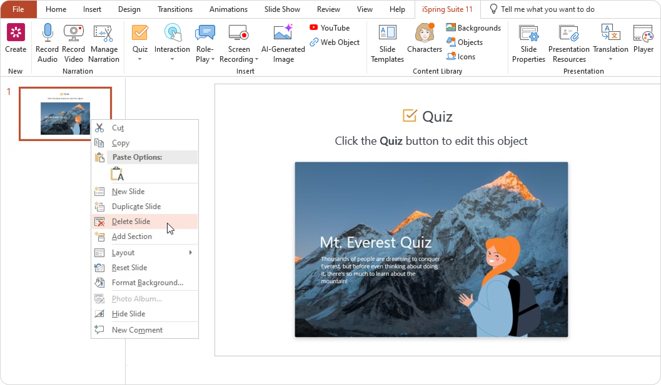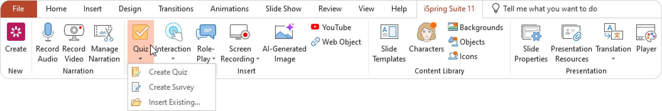 Click the Quiz button on the toolbar. Create a new quiz or survey or select a quiz or survey that was previously created with iSpring QuizMaker.
