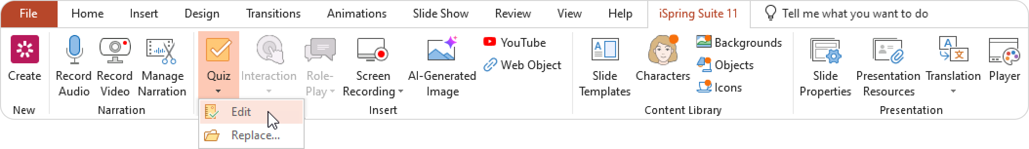 Select the slide with the quiz and click on Quiz > Edit on the toolbar.