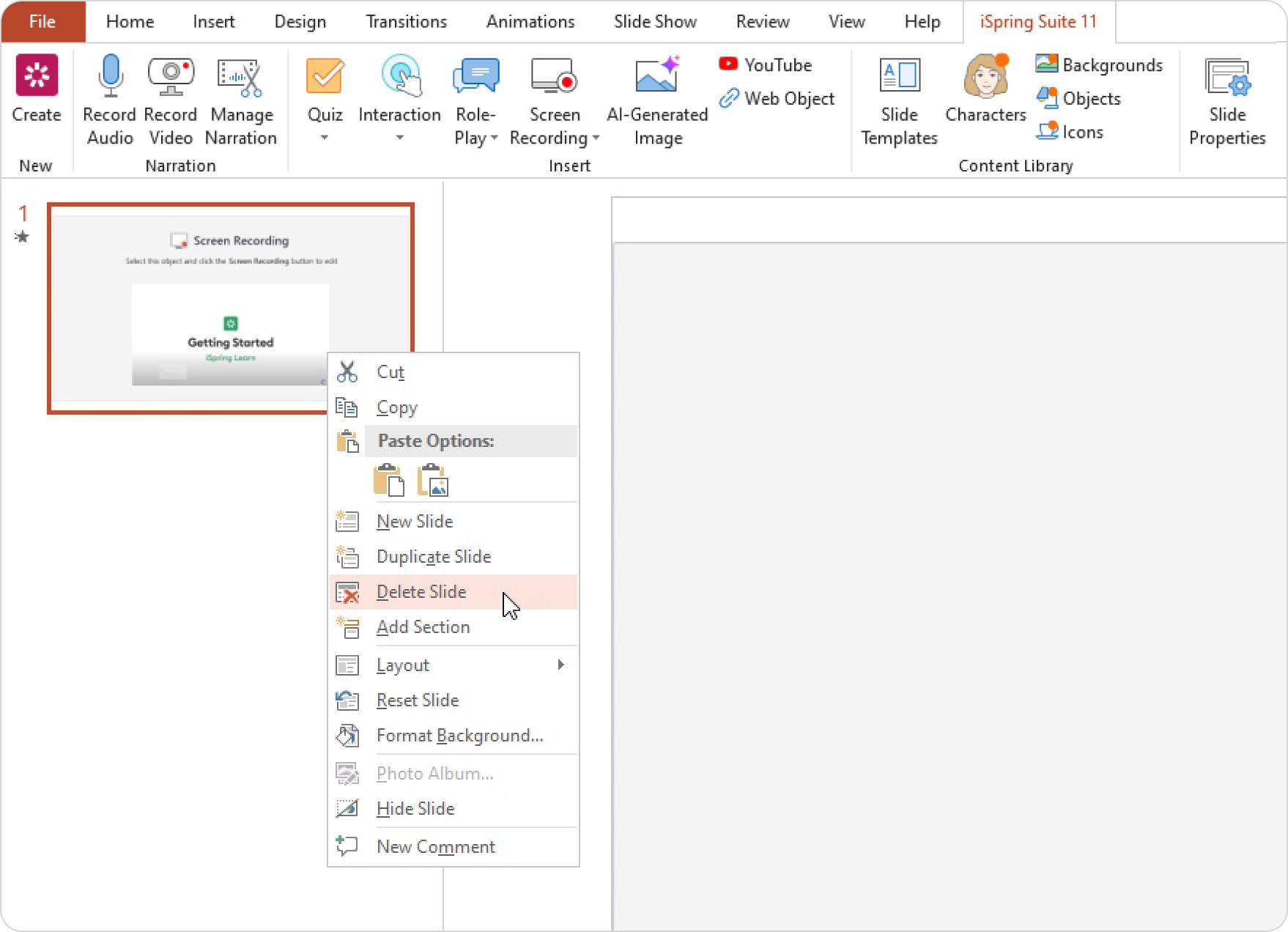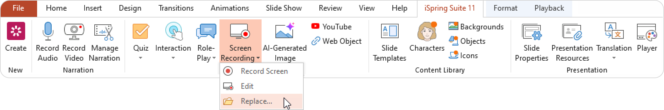 - Select a slide with a video and click Screen Recording > Replace on the toolbar.