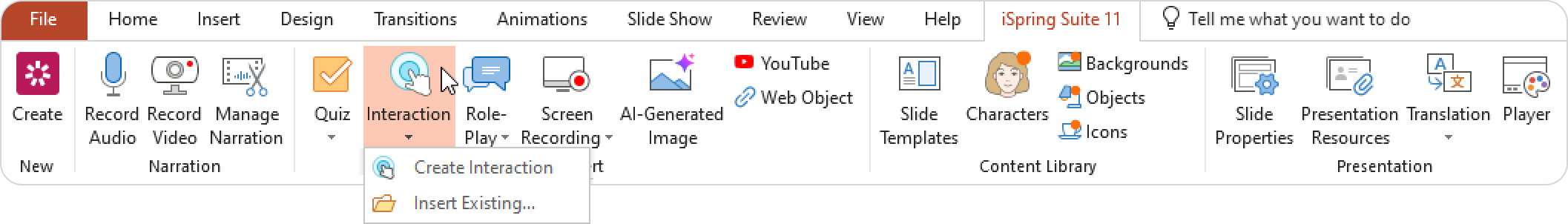 - Click the Interaction button on the toolbar. Create a new interaction or select an interaction that was previously created with iSpring Visuals.