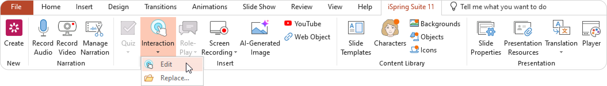 - Select the slide with the interaction and click on Interaction > Edit on the toolbar.