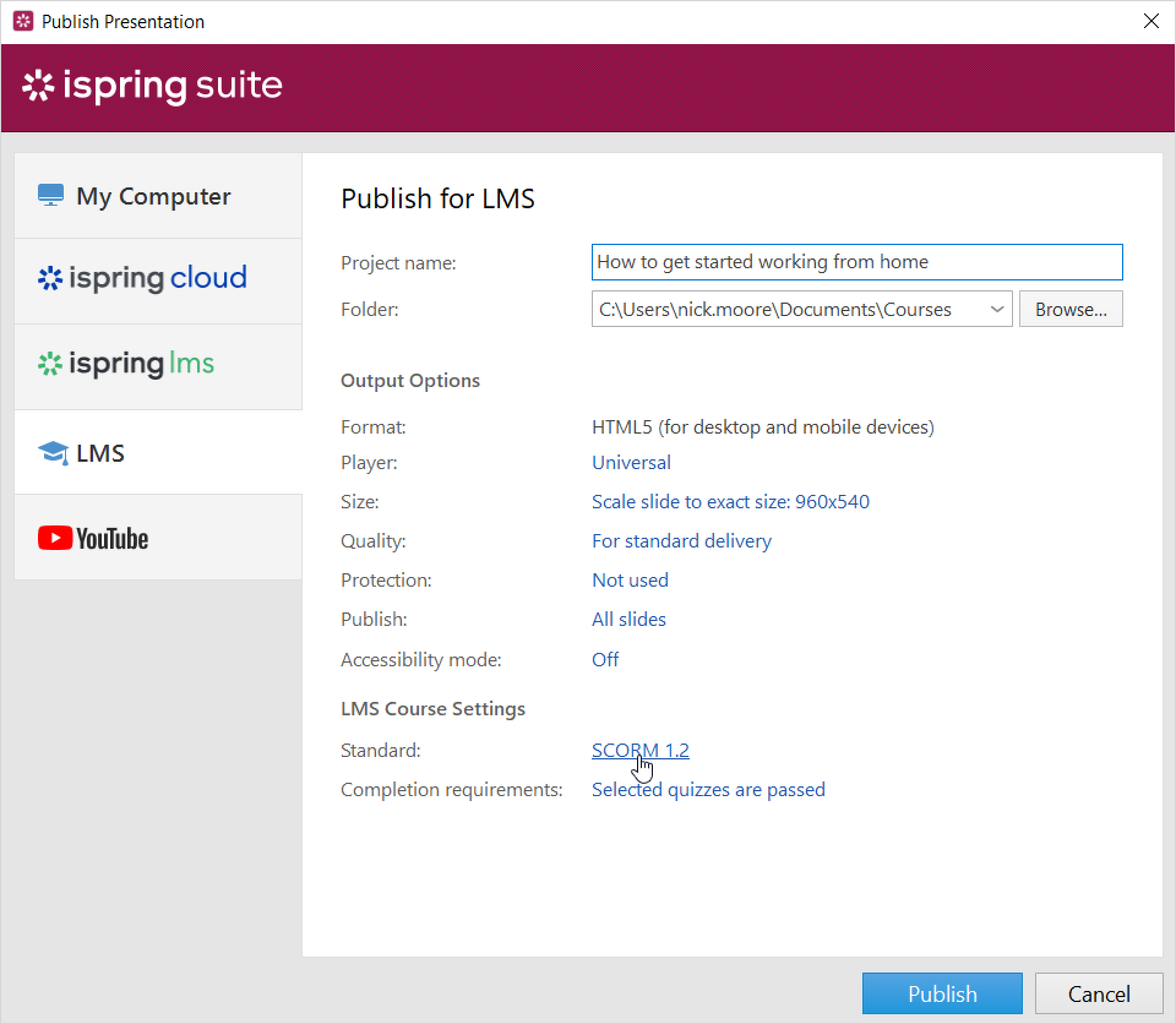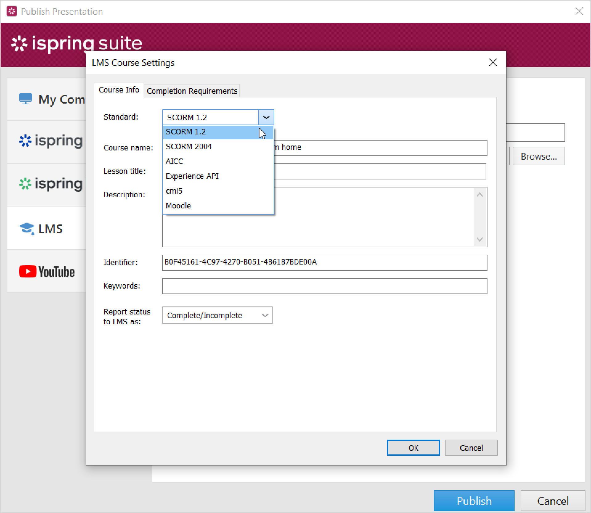 When publishing for an LMS, you can select one of the LMS standards that include information about the published course.