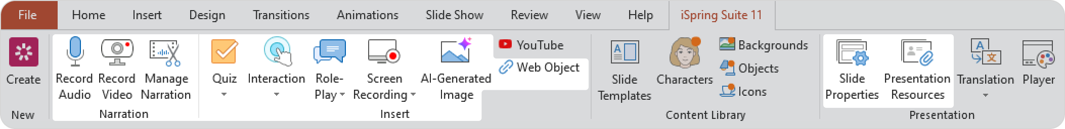 There are some actions with the iSpring Suite toolbar that don’t create a project folder. If you insert a Character, a Slide Template or a YouTube video, they become a part of the PPTX file. Also, some settings that you adjust in the Publish and Presenters dialog windows will be saved to the system folder and the PowerPoint file.