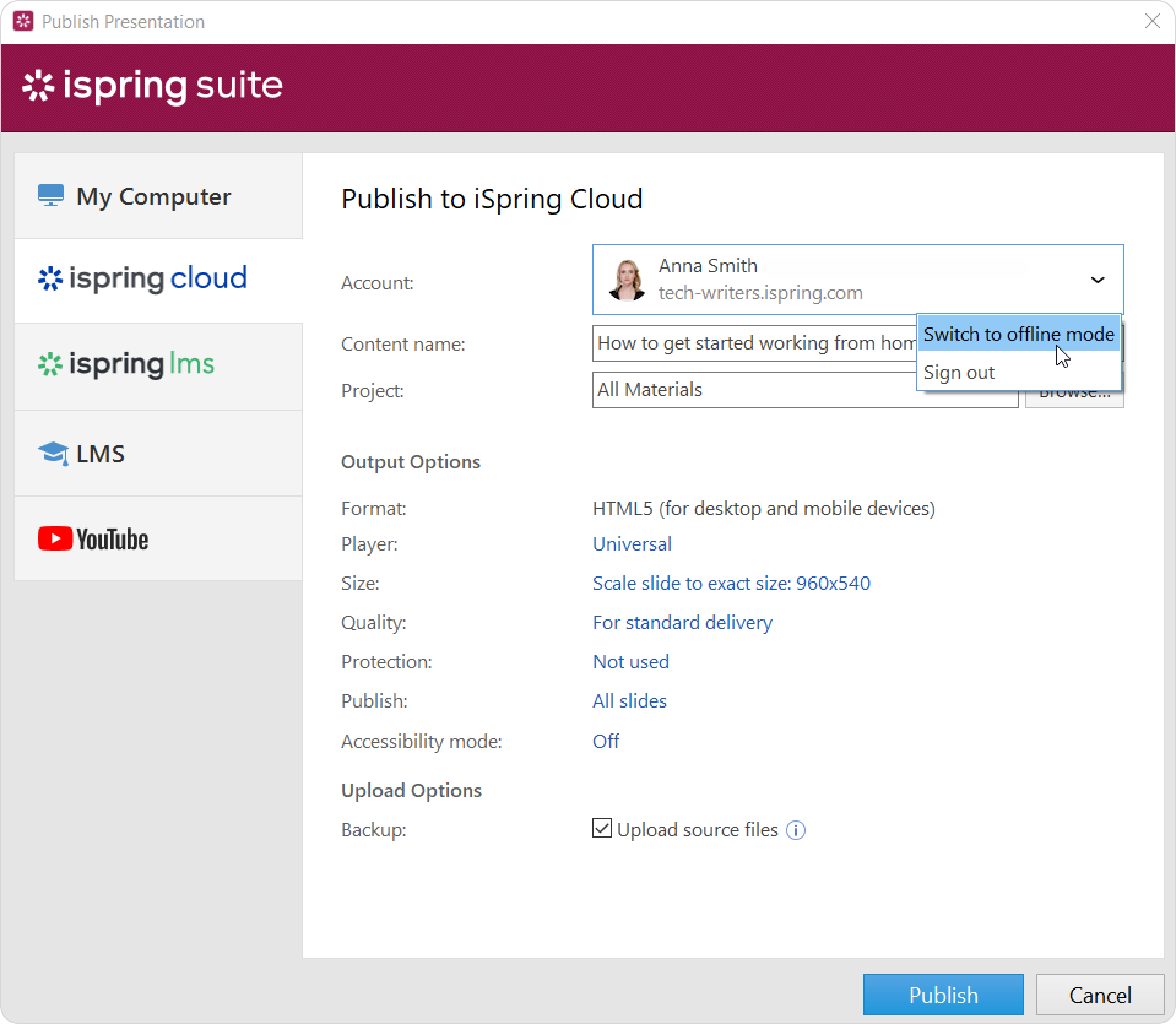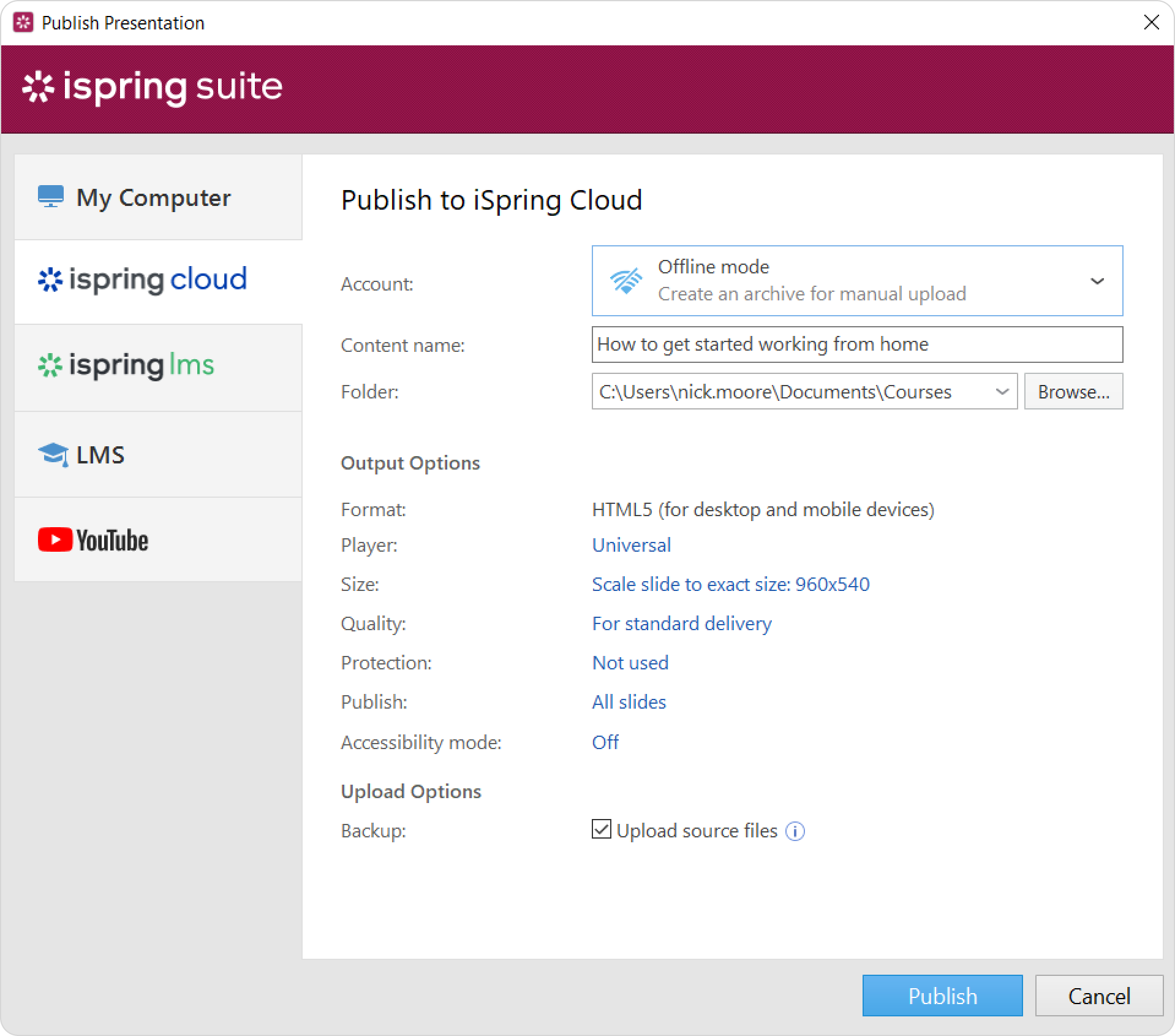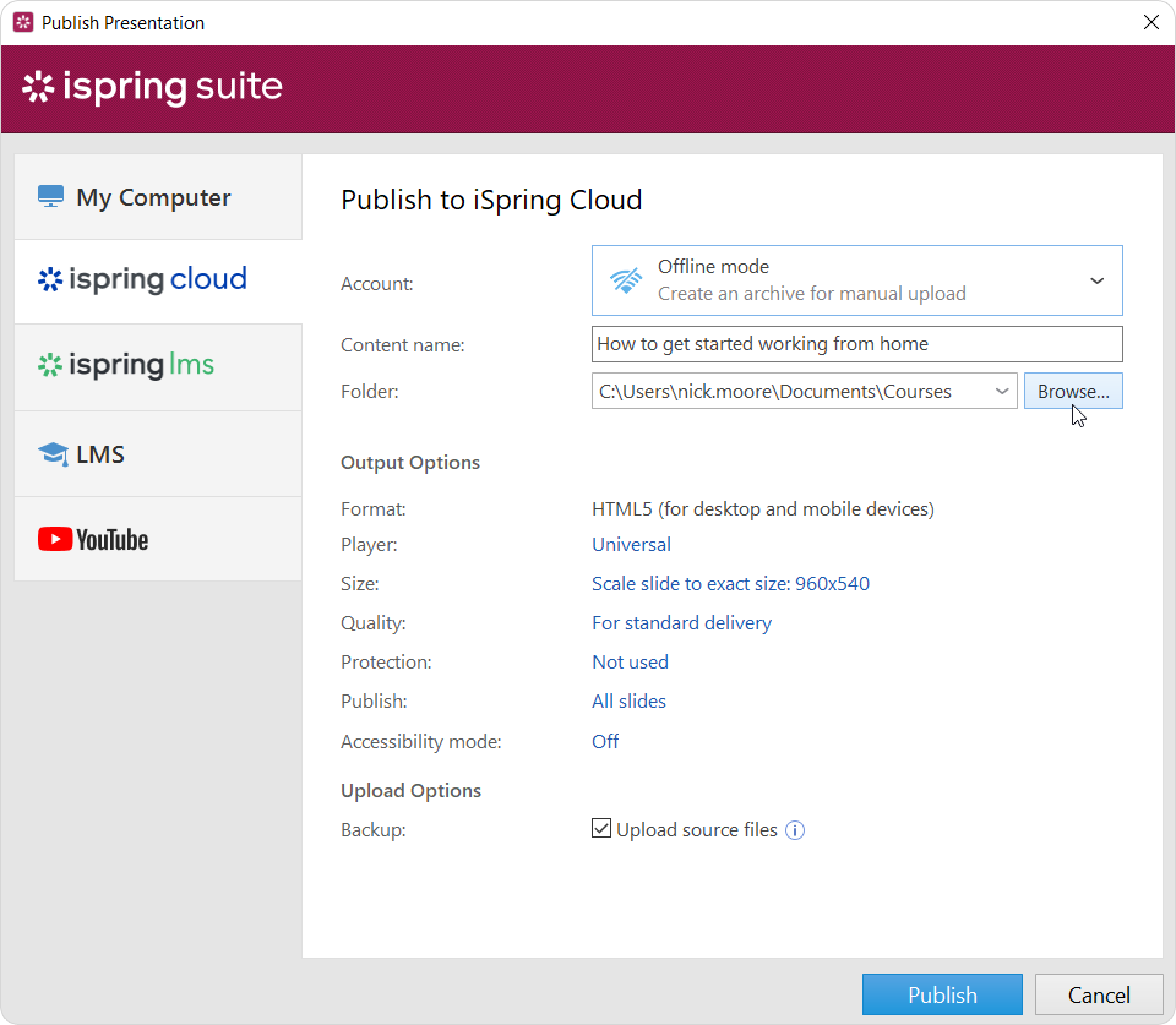 In the Backup field, select Upload source files if you want to save your course distribution files in iSpring Cloud. Use this option for teamwork or creating a backup.
