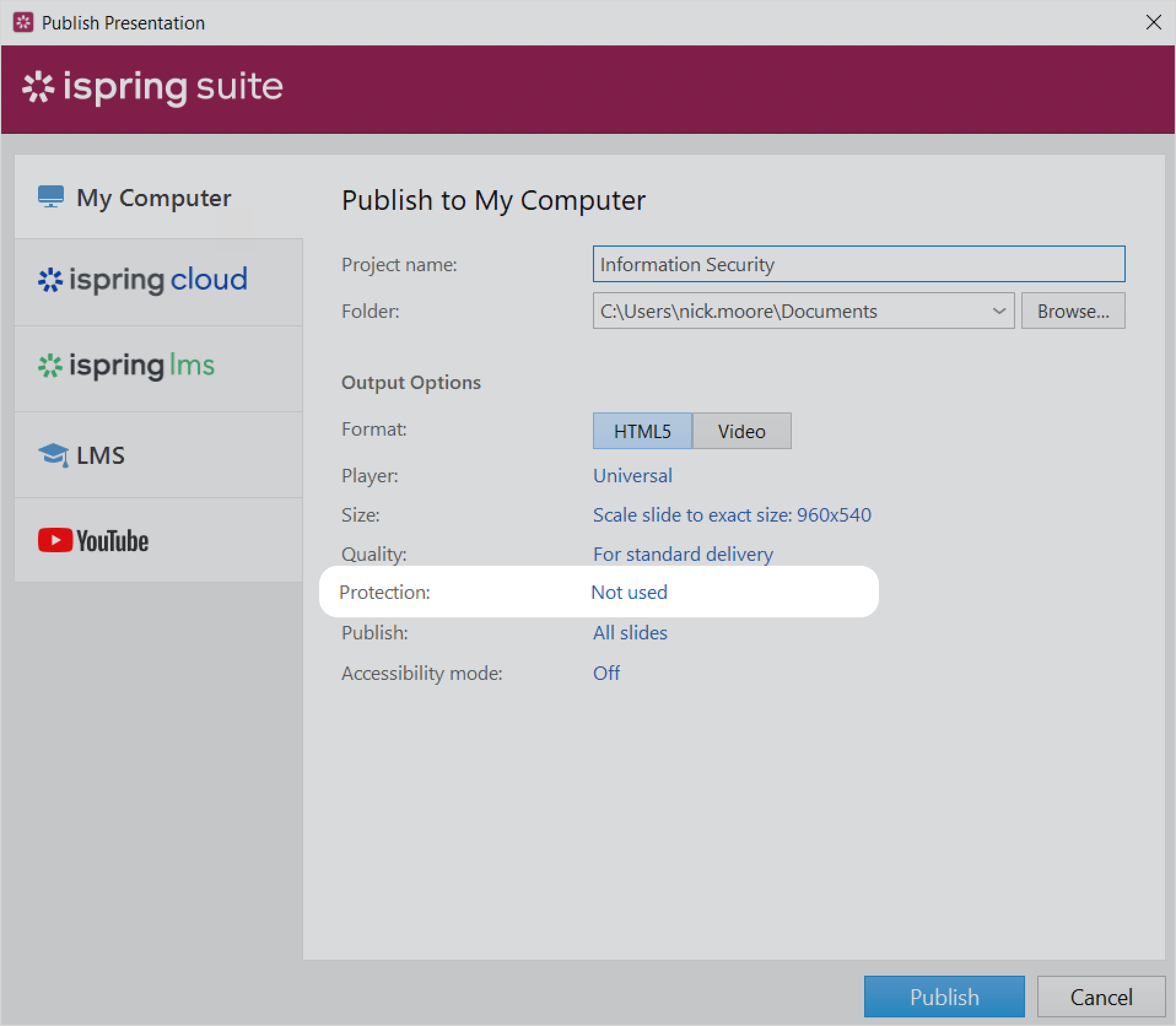 To configure your protection settings, select HTML5 format and click the link in the Protection field.