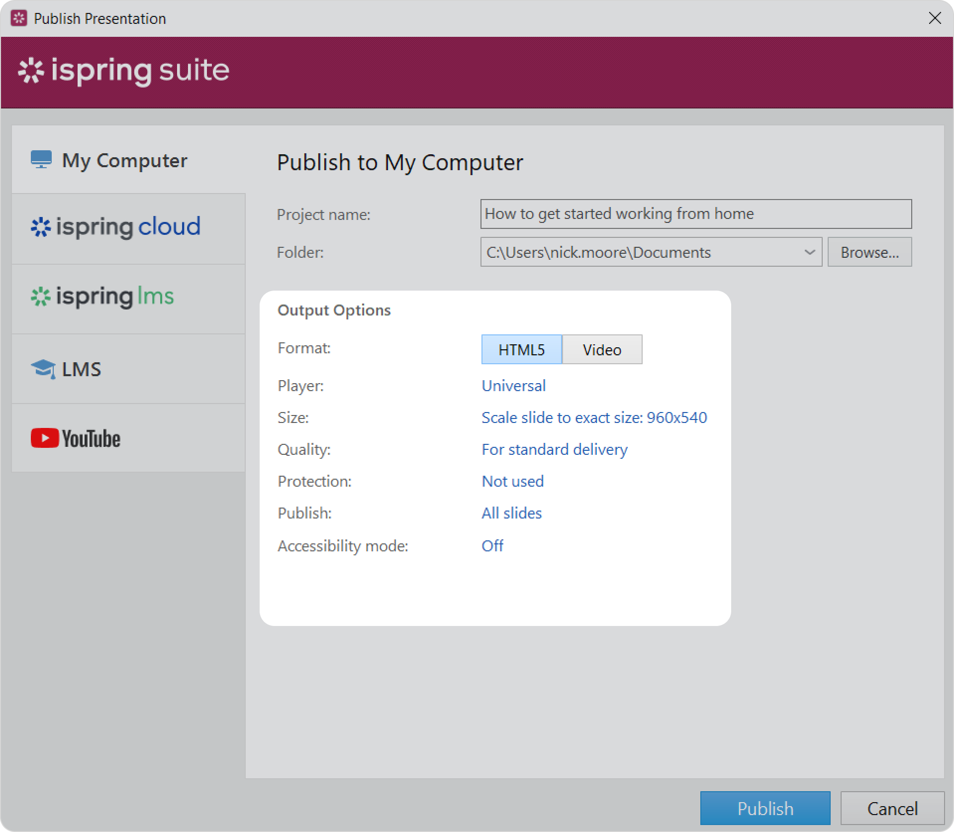 In the opened window, select a publishing destination. •My Computer Publish a course on your computer. • iSpring Cloud Publish a course to iSpring Cloud, a service for creating and storing content. • iSpring LMS Publish a course to your iSpring LMS account. • LMS Publish a course to SCORM, AICC, Tin Can, or cmi5 format for subsequent upload to any LMS. • YouTube Publish a course in video format and upload it to your YouTube channel.