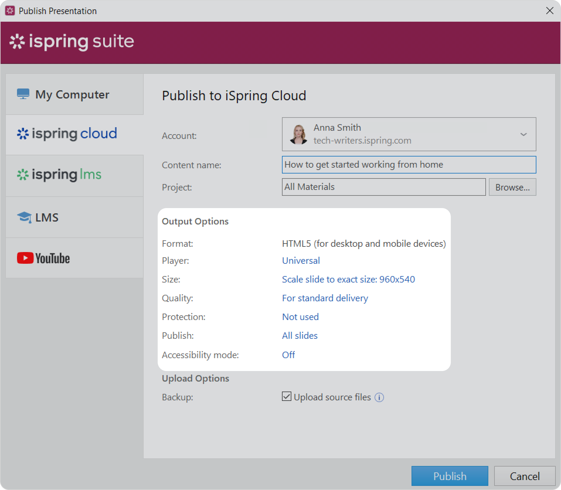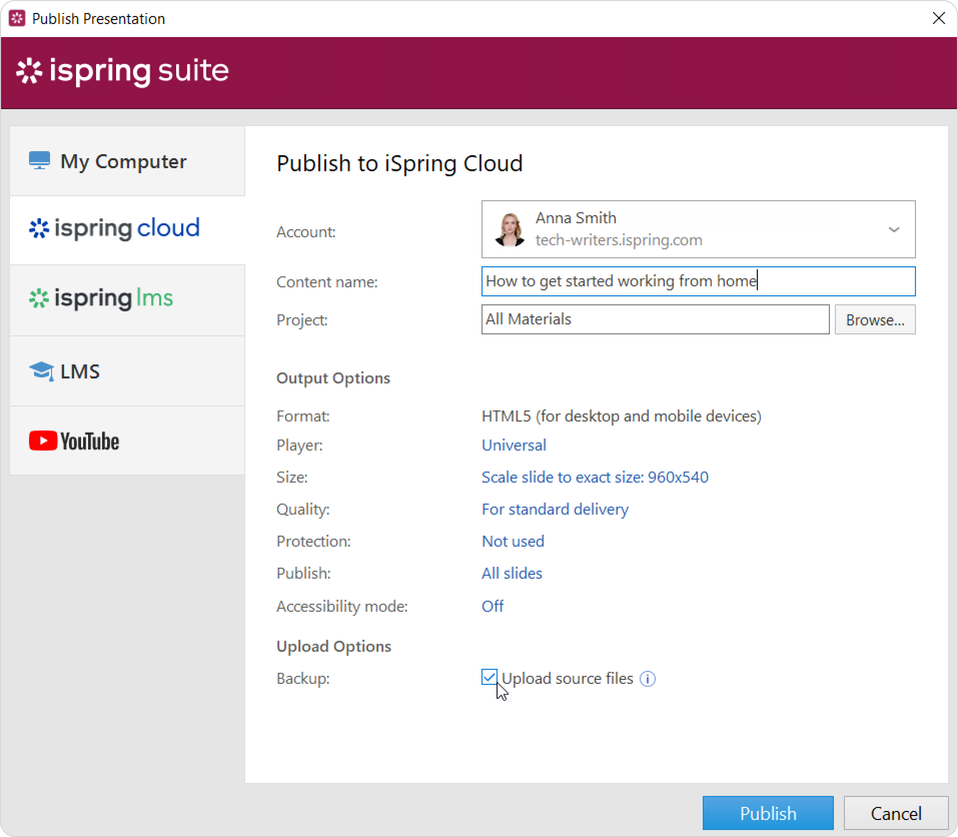 6. In the Backup field, select Upload source files if you want to save your course distribution files in iSpring Cloud. Use this option for teamwork or to create a backup.