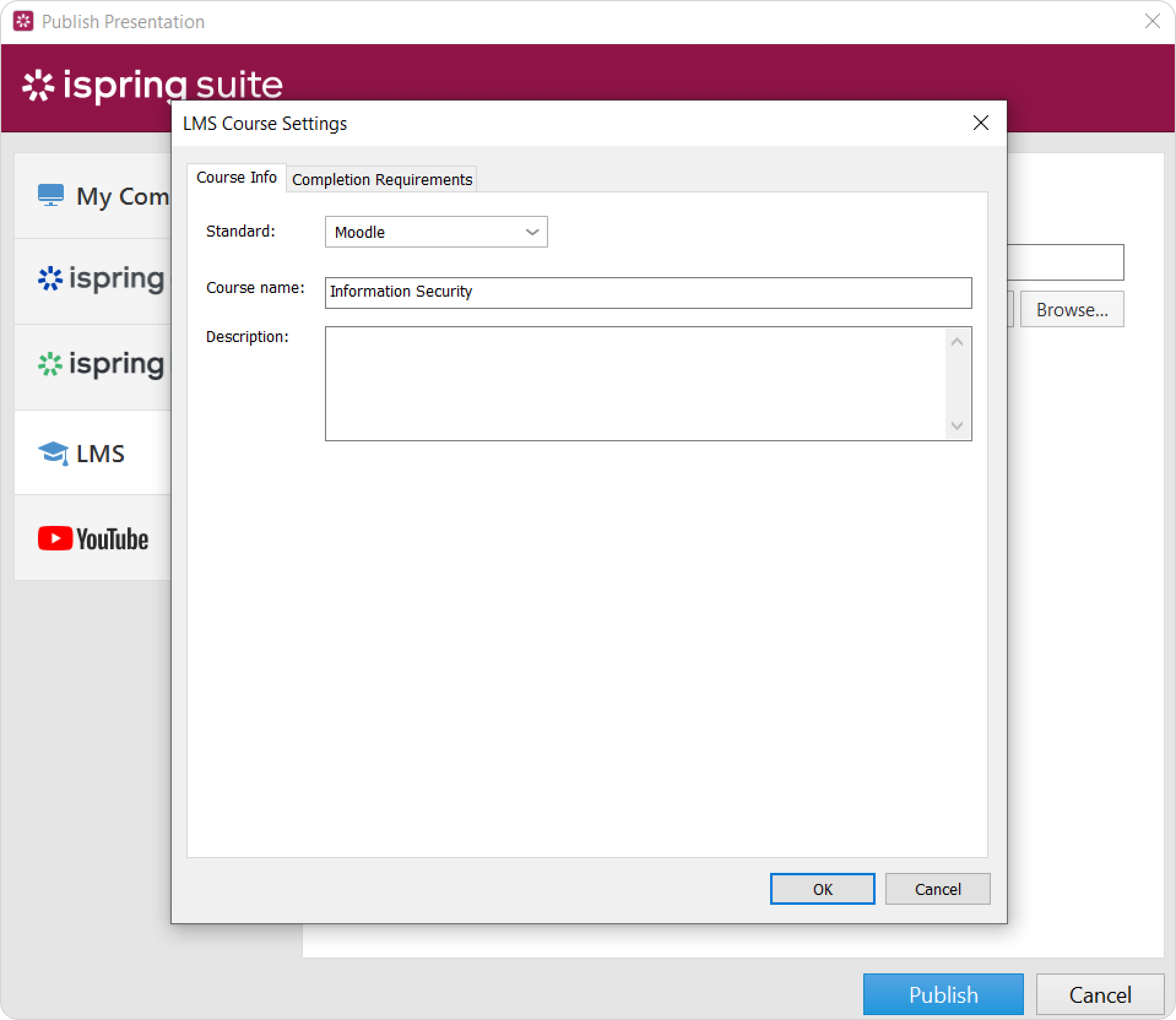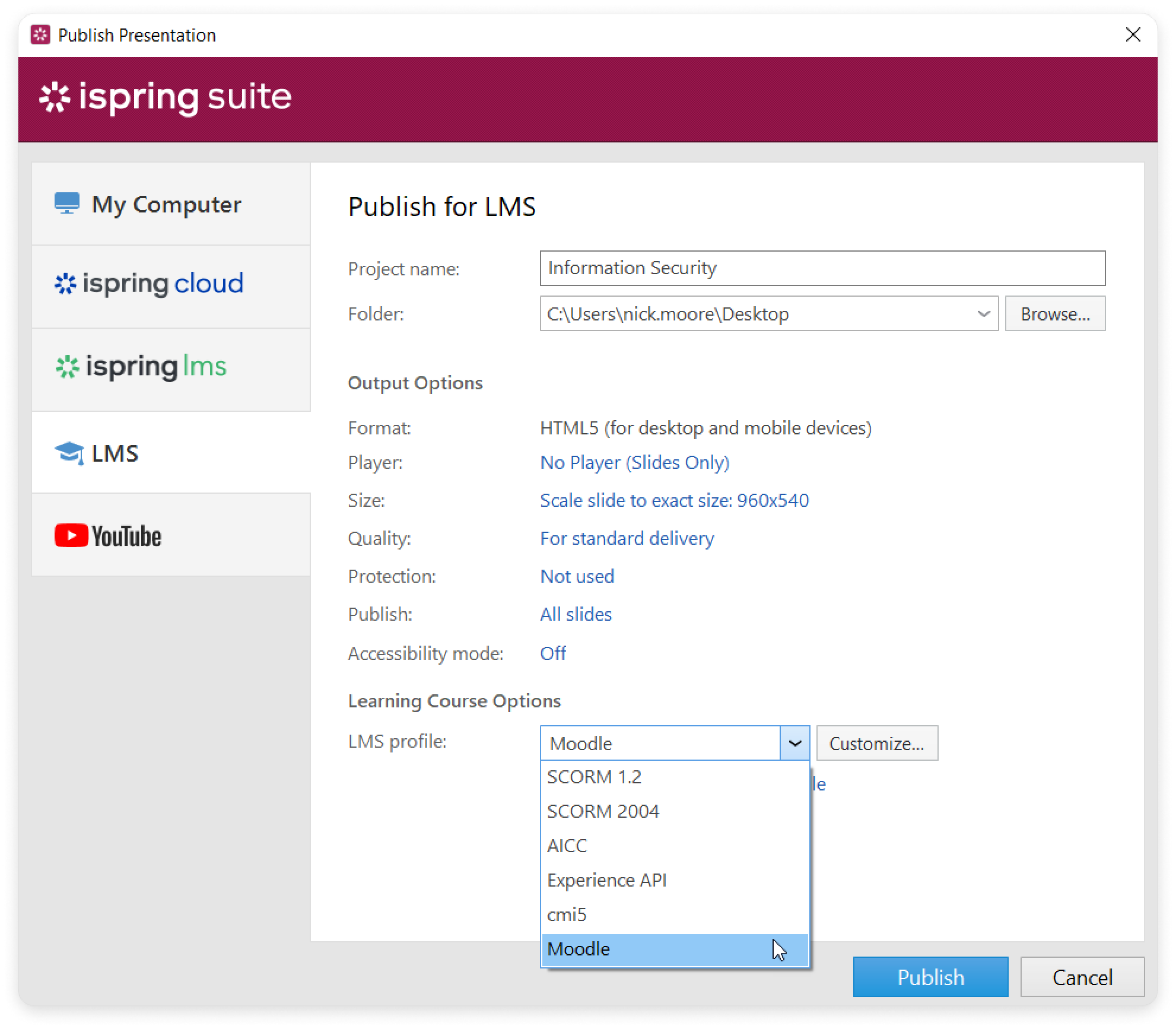iSpring Suite 11 Publishing Courses Publishing Destinations Publishing to an LMS Current: Publishing to Moodle Publishing to Moodle Click on Publish on the iSpring Suite toolbar.In the LMS tab, select LMS profile > Moodle.Customize the progress and completion of the course.Click on Publish. You'll see a .zip file that you can upload to Moodle. How to Install the iSpring Module Plugin How to Upload a Course to Moodle How to View the Course Report How to Replace the Course ×